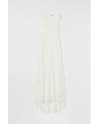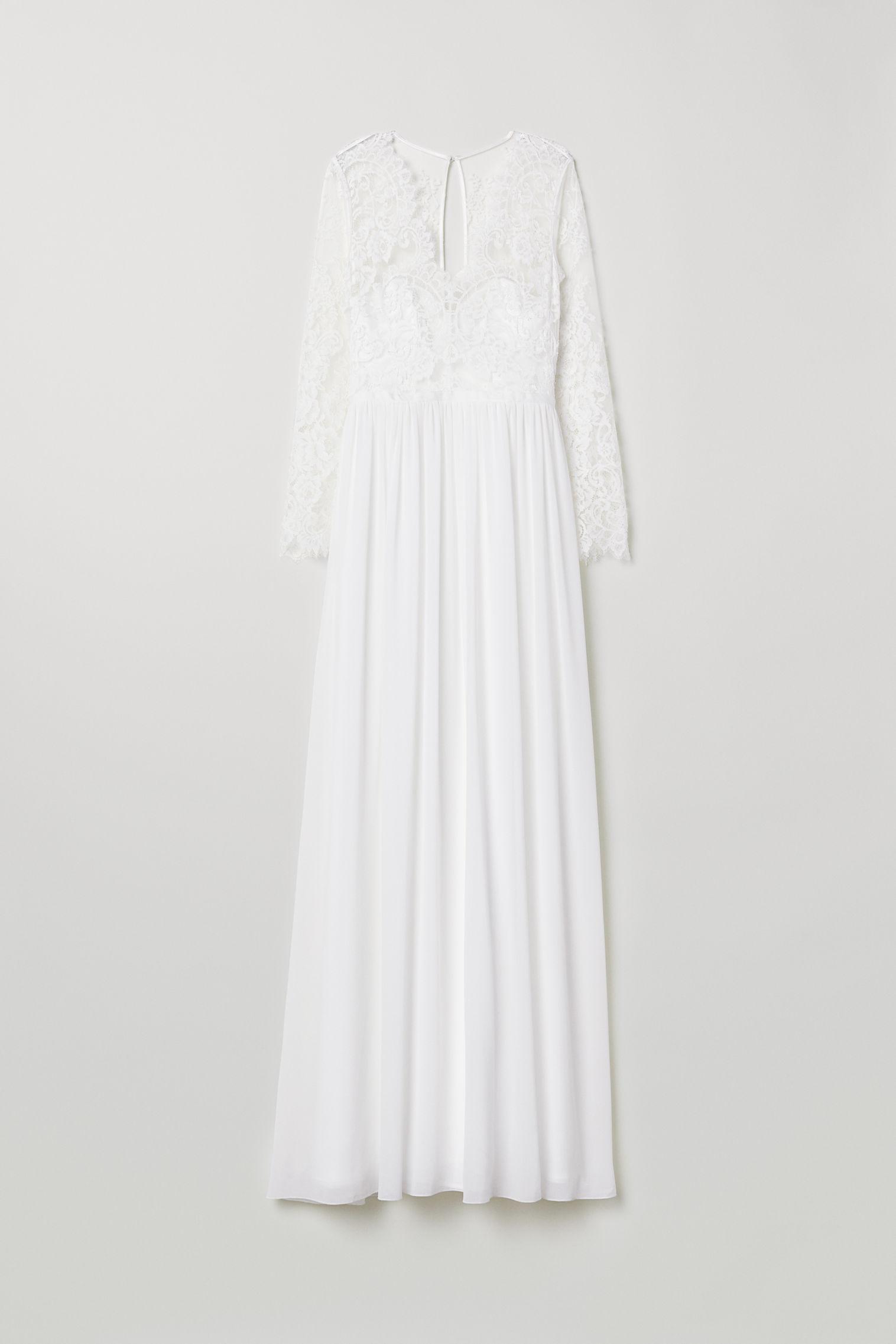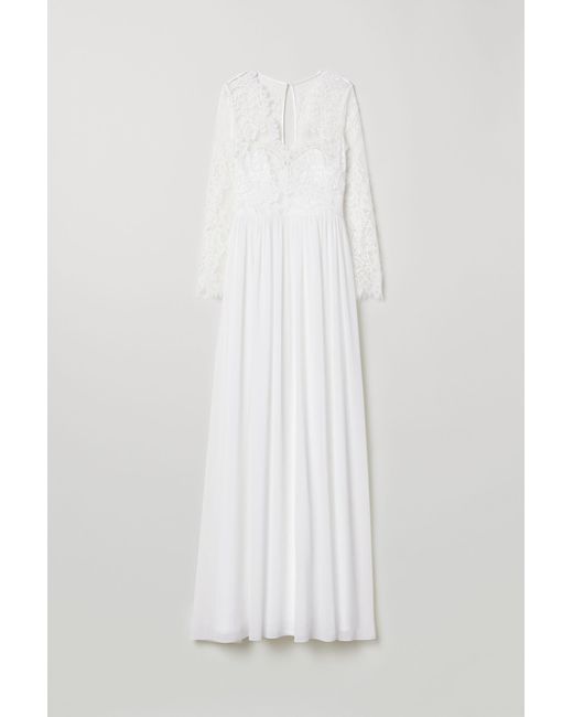 Long dress with a bodice in lace and skirt in an airy weave. Scalloped V-neck with support panels at the top, an opening with a covered button at the back of the neck and a concealed zip at the back. Long sleeves with scalloped trims, a seam at the waist with a grosgrain band, and a gently flared skirt. Lined. Colour: white