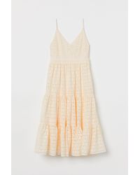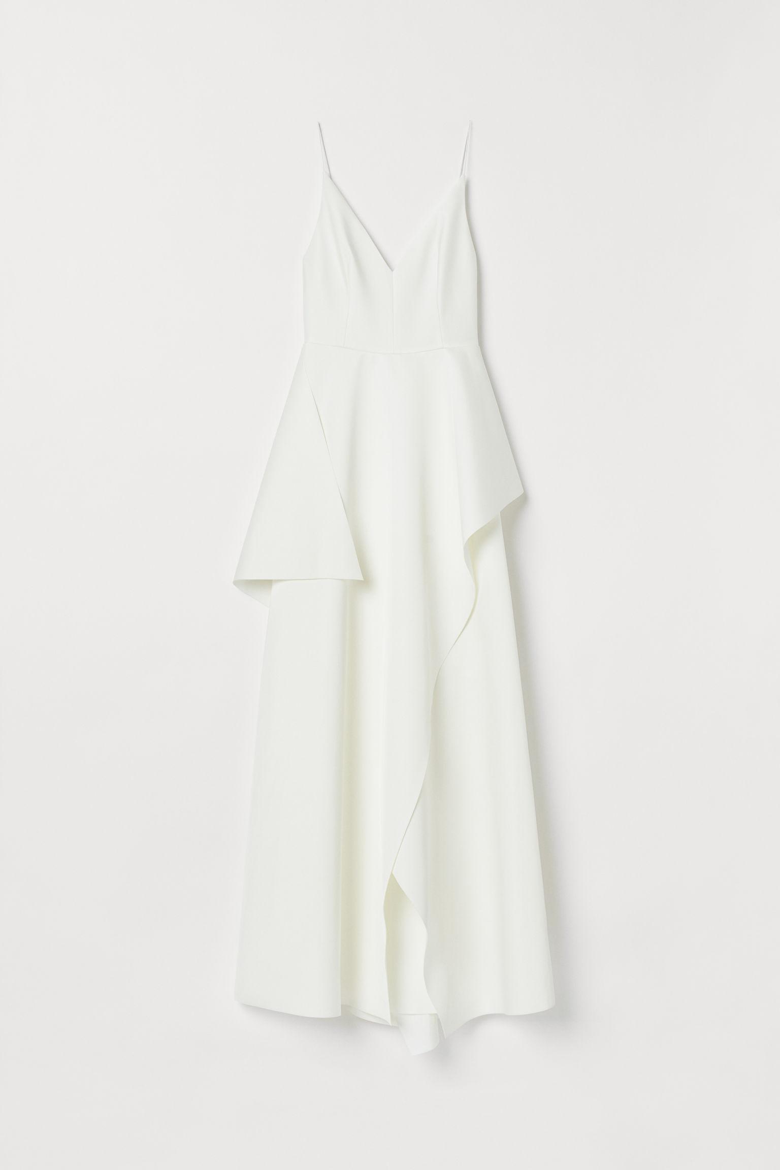 Long, sleeveless dress in sturdy satin with a deep V-neck and adjustable spaghetti shoulder straps. Concealed zip and hook-and-eye fastener at one side, a seam at the waist and a flared, segmented skirt. Satin lining. Colour: white