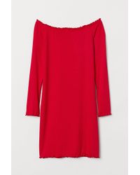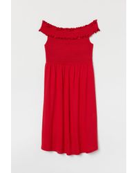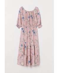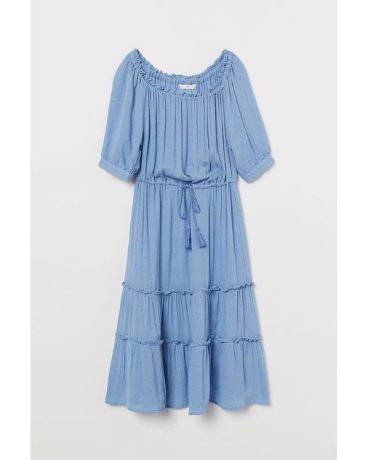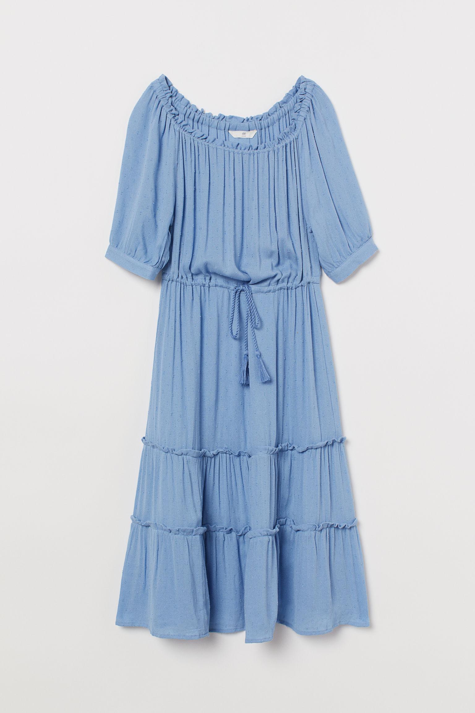 Knee-length, off-the-shoulder dress in a plumeti weave with elastication at the top and short raglan sleeves with narrow, buttoned cuffs. Seam and a twisted drawstring at the waist and tiers to the hem. Unlined. Colour: blue
