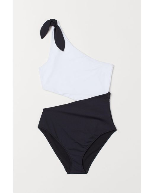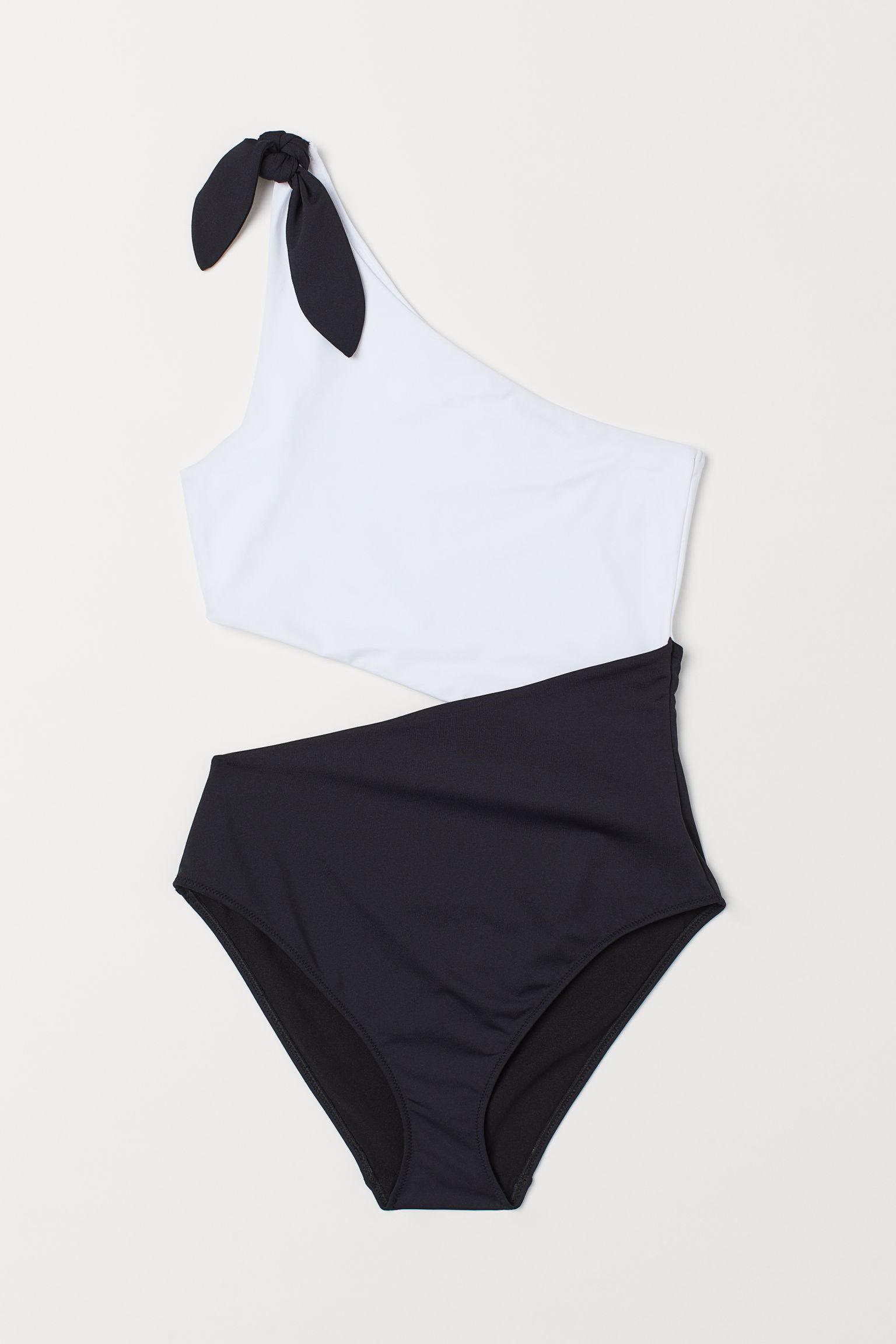Fully lined, one-shoulder swimsuit with a decorative tie detail on the shoulder and a cut-out section at the waist. Colour: black