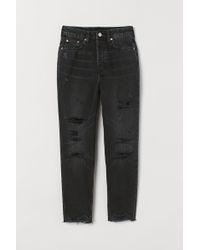 5-pocket, ankle-length jeans in washed denim with hard-worn details, a high waist and gently tapered legs with raw-edge hems.