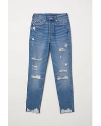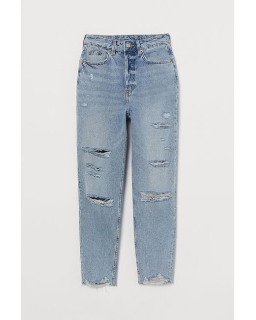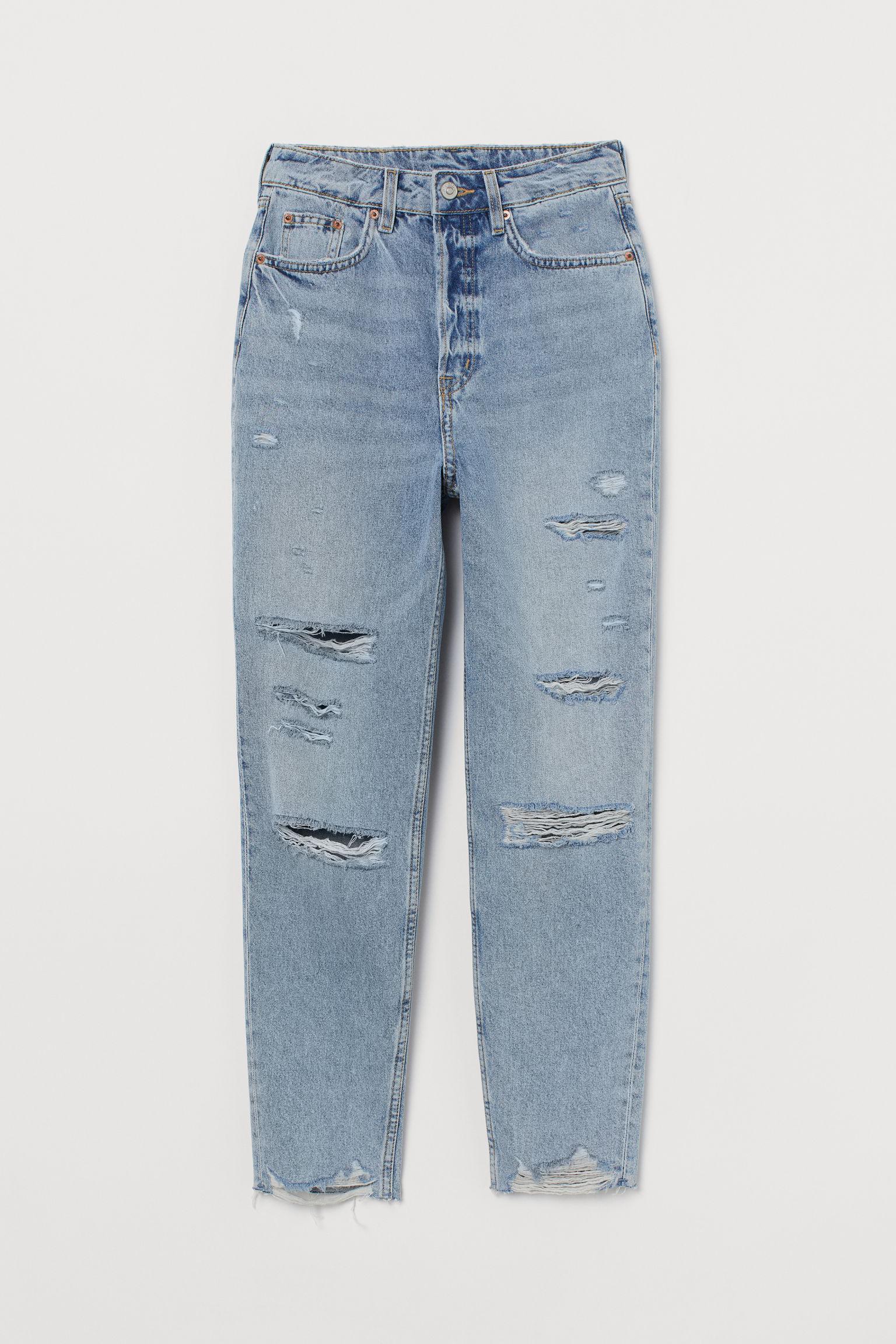 5-pocket, ankle-length jeans in washed denim with heavily distressed details. High waist and gently tapered legs with raw-edge hems. Cotton 100%. Machine wash cool. Colour: blue