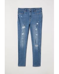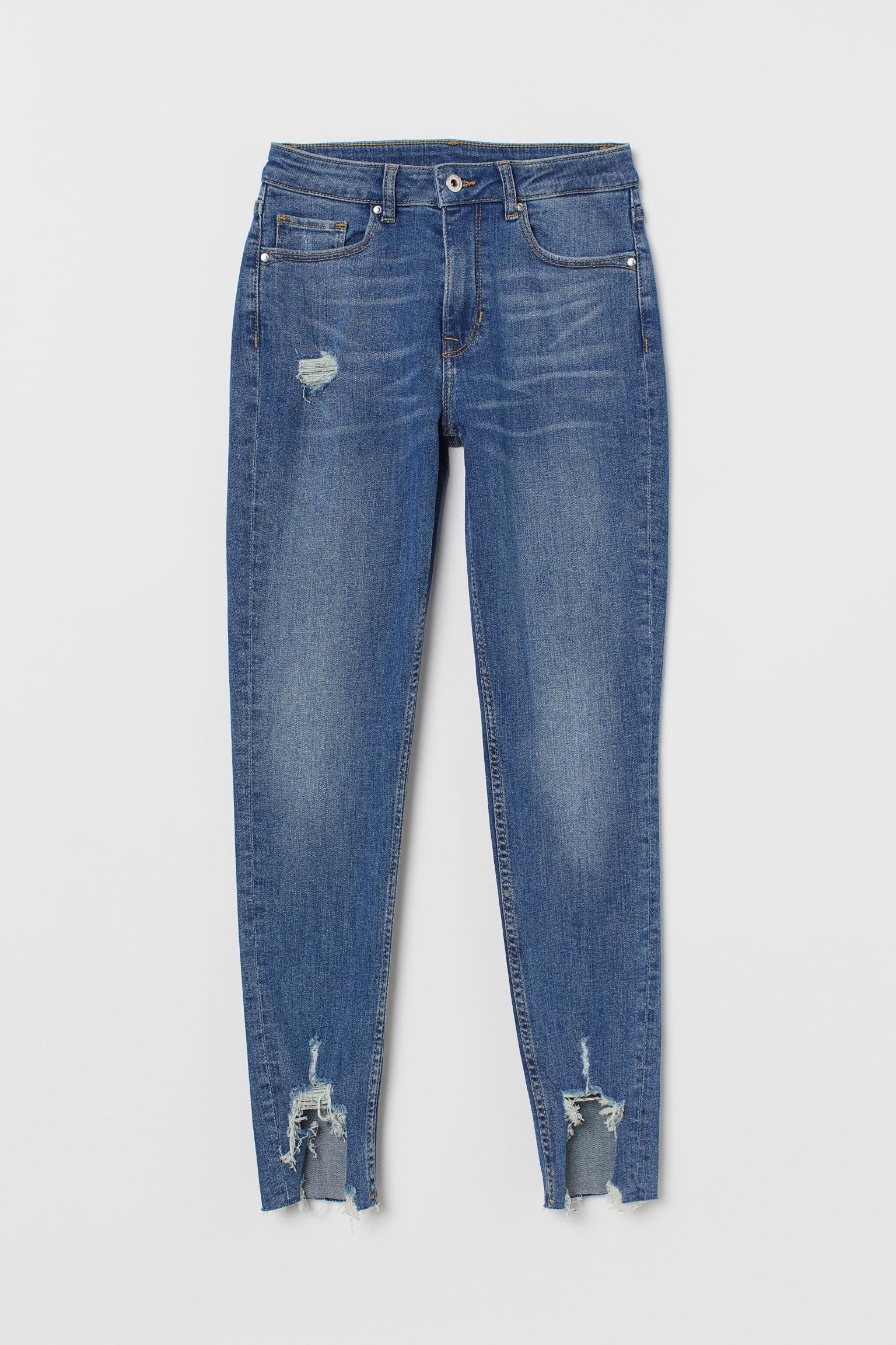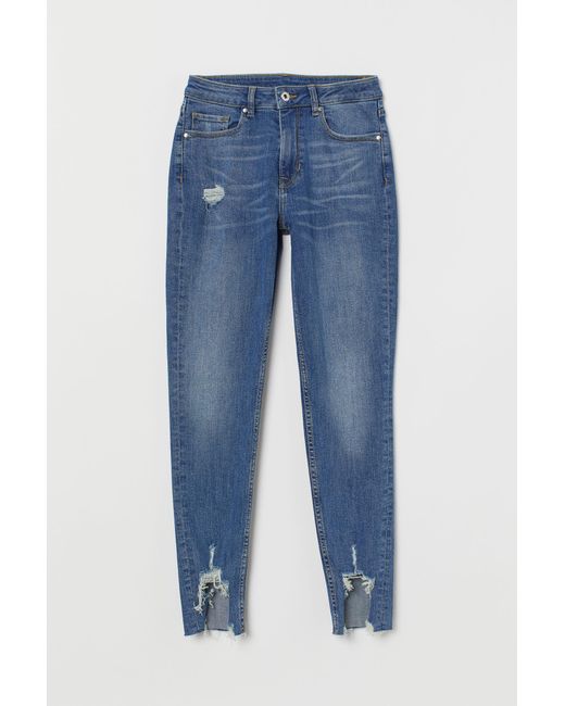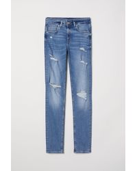 5-pocket jeans in washed superstretch denim. Heavily distressed details, regular waist, and zip fly with button. Super-skinny legs with raw-edge hems. Cotton 99%, Elastane 1%. Machine wash cool. Colour: blue