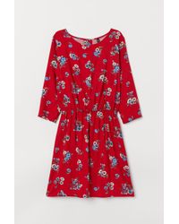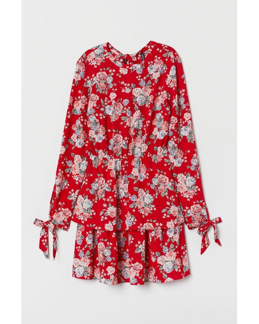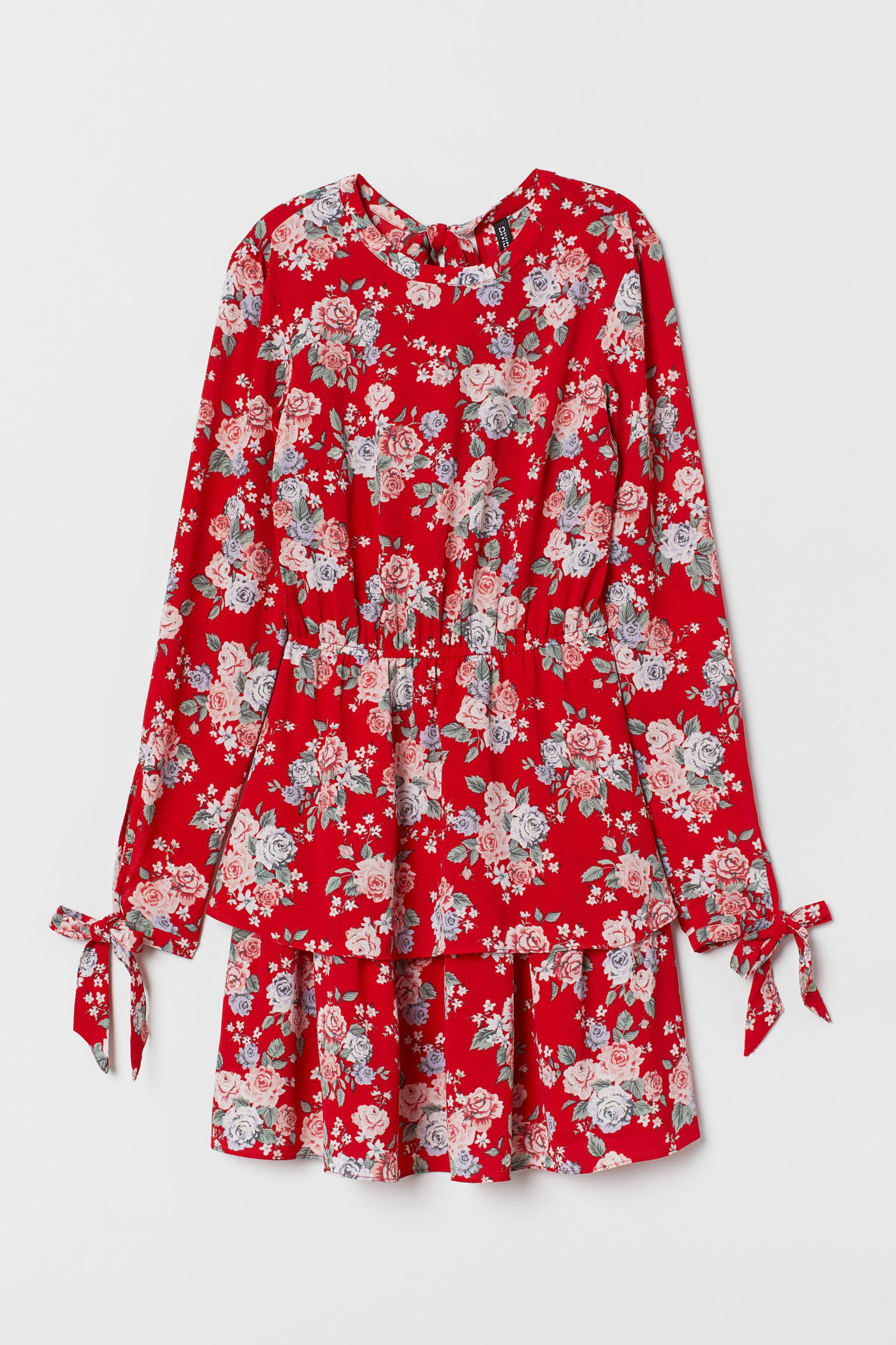 Short dress in woven, crêped fabric with a printed pattern. Open back with ties at back of neck. Long sleeves with opening and tie at cuffs. Smocked seam at waist and flared, tiered skirt. Unlined. Polyester 97%, Elastane 3%. Lining: Polyester 100%. Machine wash cold. Colour: red