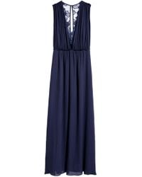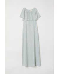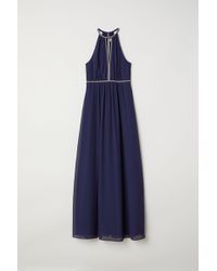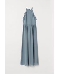 Long dress in woven fabric with a V-neck, wrapover front, wide tie at the waist and short, double-layered sleeves. Unlined. Colour: blue