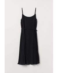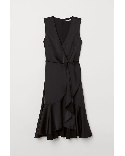 Knee-length, sleeveless dress in woven fabric with a double-layered top, V-neck and sewn-in wrapover at the front. Concealed zip at the back and a seam with a tie belt at the waist. Unlined skirt. Colour: black