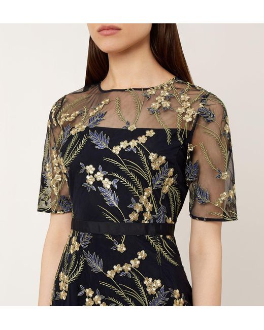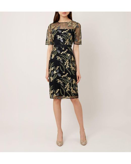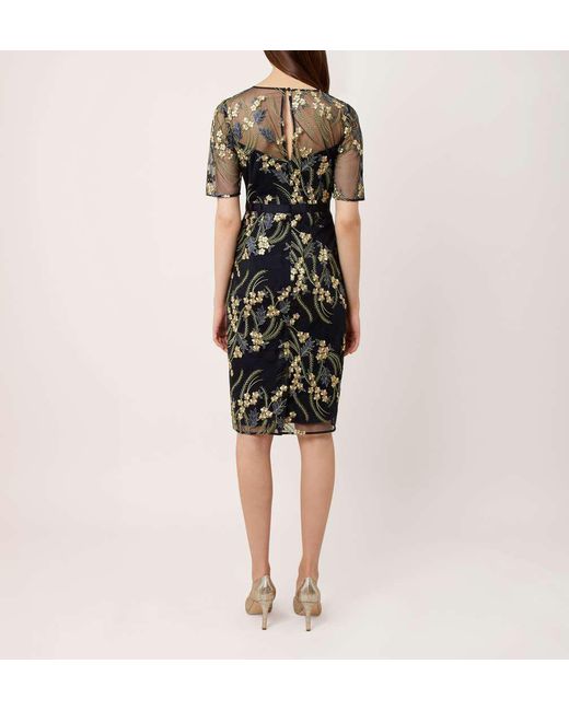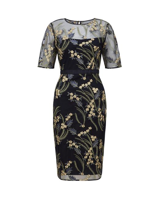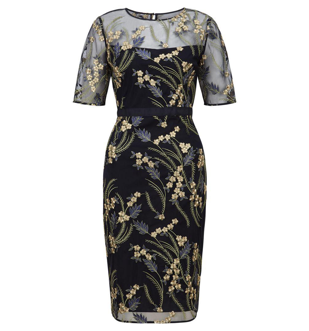 Length from nape to hem. 99.5cm. Navy Multi. Fabric composition. 100% Polyamide. Trim. 68% Polyester, 32% Metallised fibre. Lining. 100% Polyester. Washing instructions. Dry clean. 5582. Weddings, garden parties, evenings out. You need a dress that can do all three. Cue the Phoebe. In an elegantly tailored fit, metallic floral embroidery brings a little dazzle after dark, while a carefully placed grosgrain ribbon trims the waist, optimising the Phoebe's flattering silhouette. Wear it with simple courts to allow the intricate embroidery to do all the talking. Model is 175cm/5'9'' and is wearing a size UK 8. Colour: multicolour