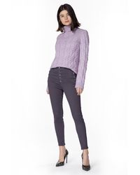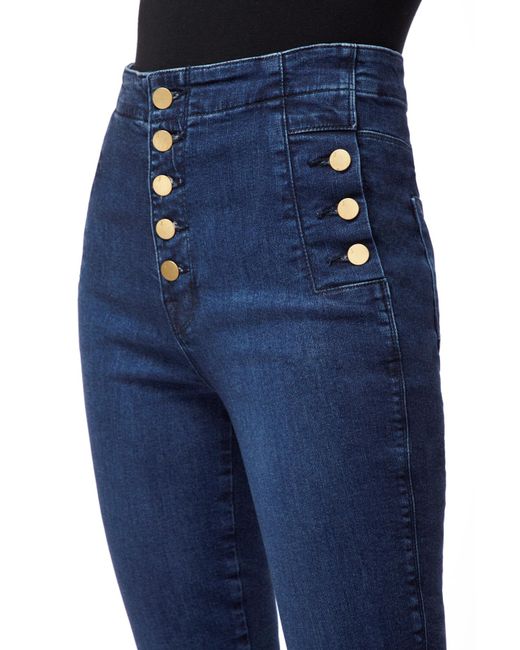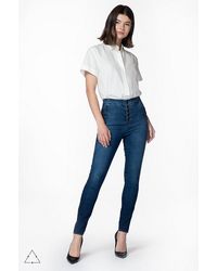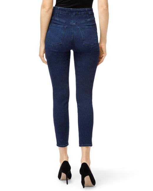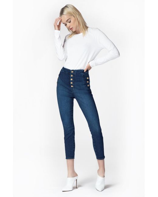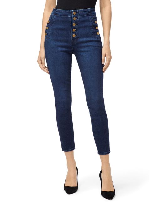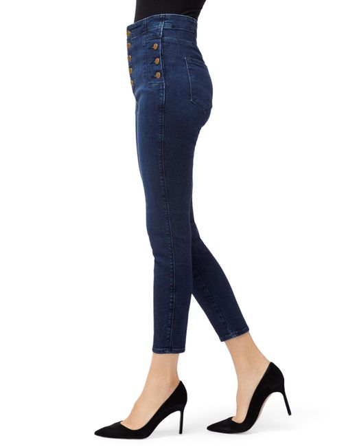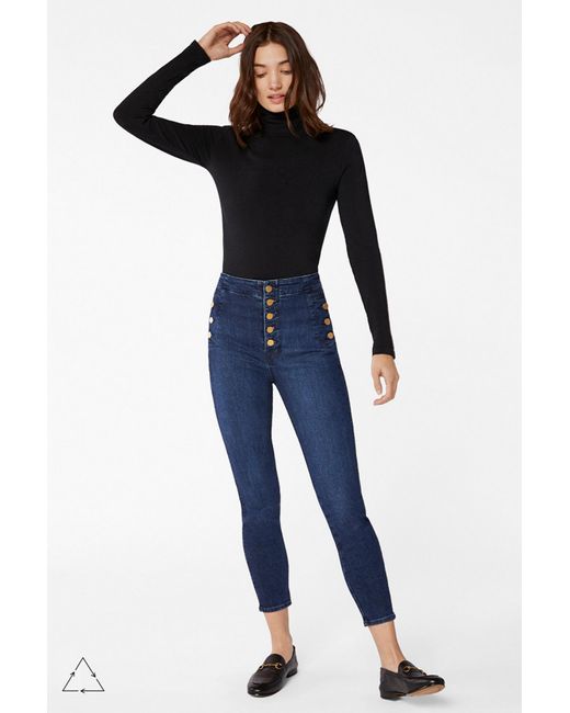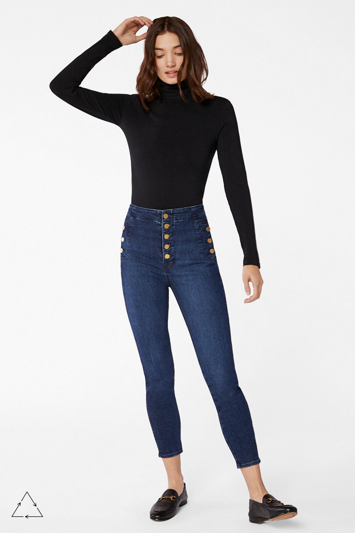 From our sustainable denim offering. Our popular Natasha ultra high-rise super-skinny with statement-making buttons at the fly and hips to cinch you in at the waist. A super-skinny fit through the entire leg with a cropped inseam, in a true blue indigo wash. This denim is made with up to 30% recycled cotton as well as sustainably produced biodegradable fibres and botanical polyesters. Finished with sustainable gold buttons for a polished impact. The wash process utilizes 90% less water, on average. Cropped. Super Skinny. High-Rise. 11.25-Inch Rise. 26-Inch Inseam. 9.75-Inch Leg Opening. Sustainable Denim. 73% Cotton, 25% Lyocell, 2% Polyurethane. Made and Designed in USA. Colour: blue