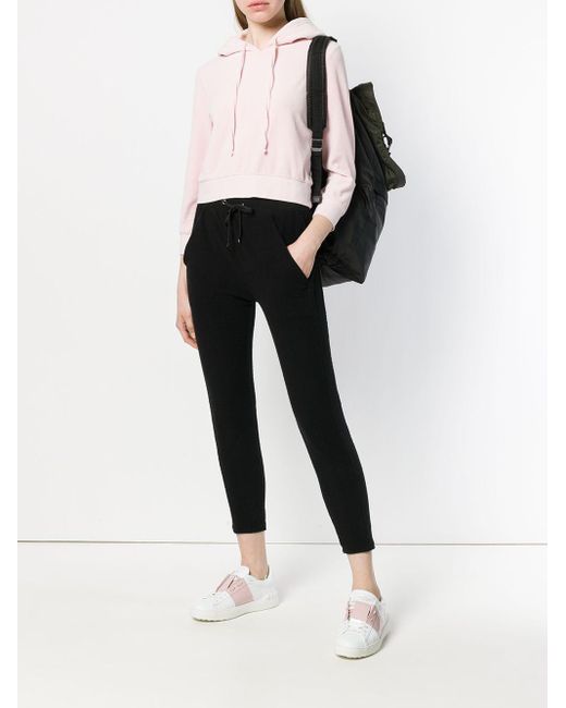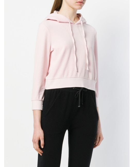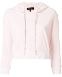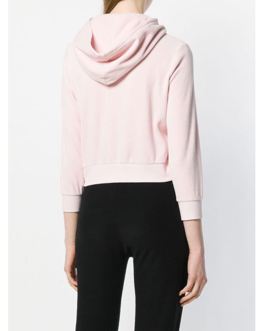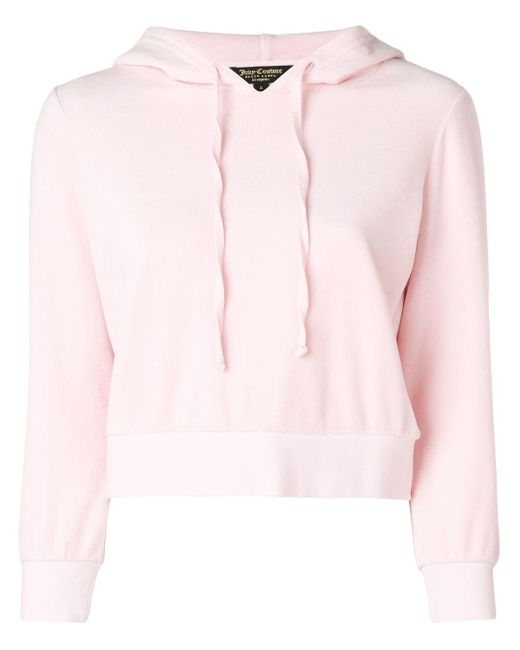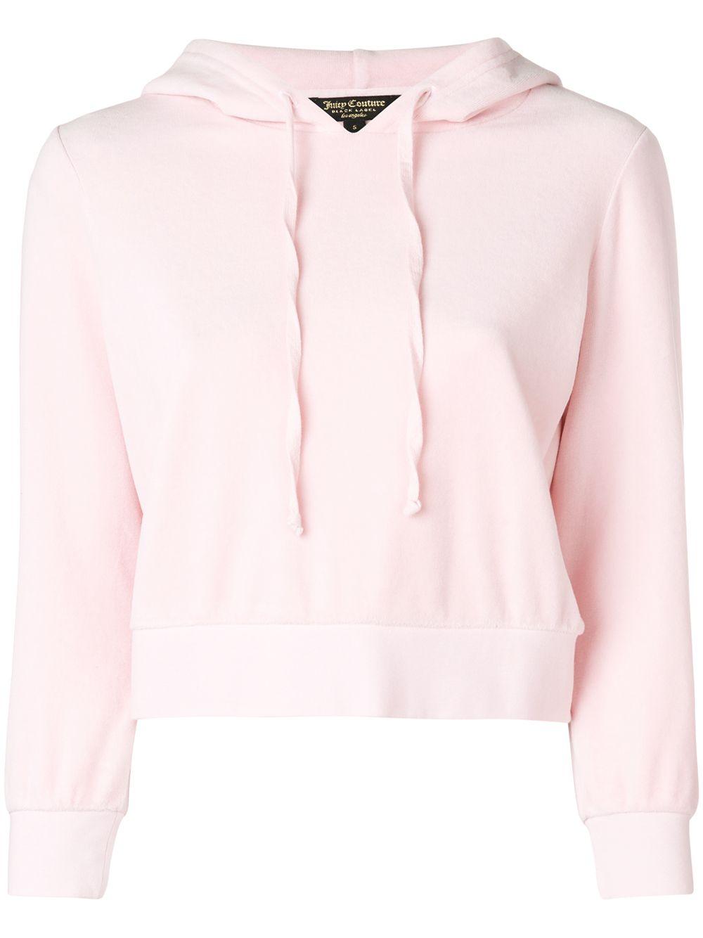 Light pink cotton blend velour shrunken hooded pullover from Juicy Couture featuring a hood with drawstring tie fastenings, three-quarter length sleeves, a ribbed hem and cuffs and a cropped length. Material:Polyester/Cotton. This item may not be on sale in France, UK, Italy, Belgium and Switzerland. Colour: pink