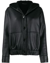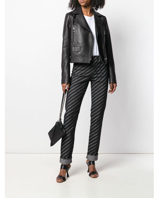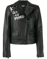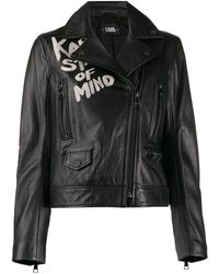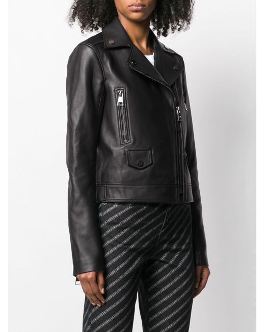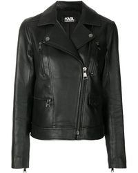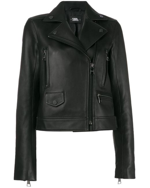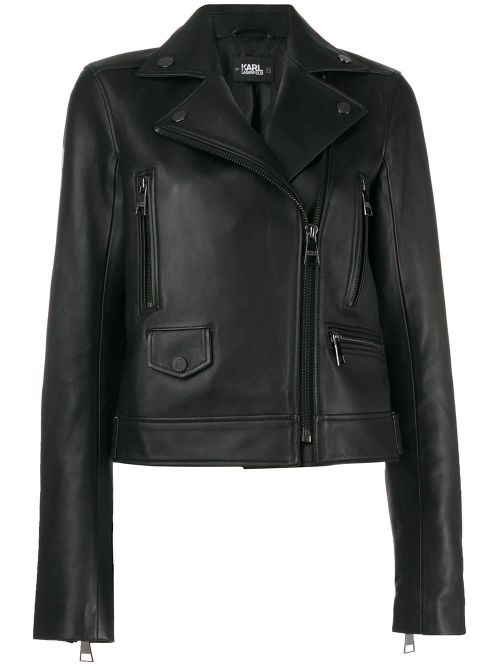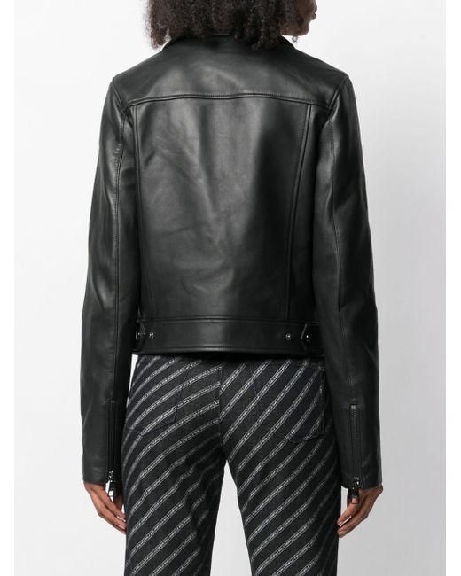 Black Ikonik leather biker jacket from Karl Lagerfeld featuring a pointed collar, an off-centre front zip fastening, front zipped pockets, long sleeves, zip cuffs, side waist tabs, a logo printed lining and a short length. Material:Leather. Colour: black
