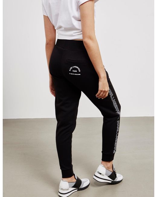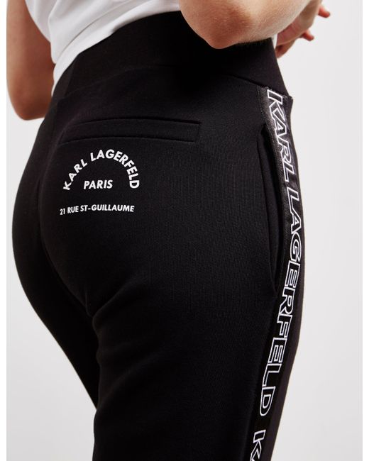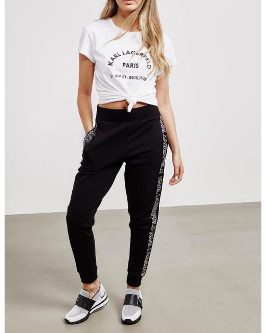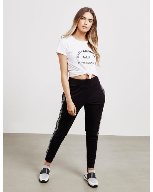 Cutting edge fashion is at the centre of karl lagerfelds fashion ethic, creating aesthetic and relevant rock-chic designs that fill your wardrobe with inspiration and style. Applying this to every aspect of the brand, they present these online exclusive logo track trousers which come in a black colourway and feature tape style branding to the seams to create the perfect down time staple. Details; black colourway, cotton construction, ribbed cuffs, elasticated waist band, tonal stitching throughout, regular fit, two side pockets, one back pocket, tape style branding to the seams and branding printed to the back pocket to complete. Model is 5'9" and wears a size 8. Colour: black