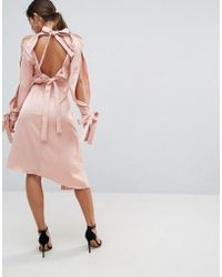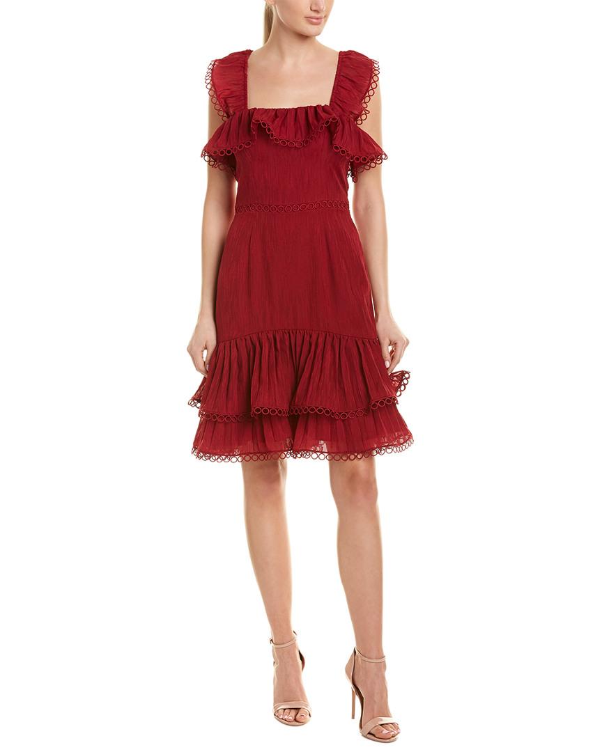 Color/pattern: berry Approximately 39in from shoulder to hem Measurement was taken from a size small and may vary slightly by size Model is 5ft 10in Design details: ruffle trim, lace trim, shirring details, tiered hem Centre back zipper closure Main: 100% polyester Trim: 100% polyester Lining: 96% polyester, 4% elastane Dry clean only Imported. Colour: red