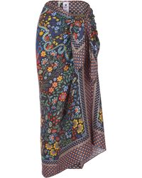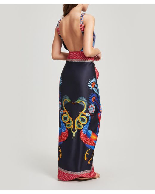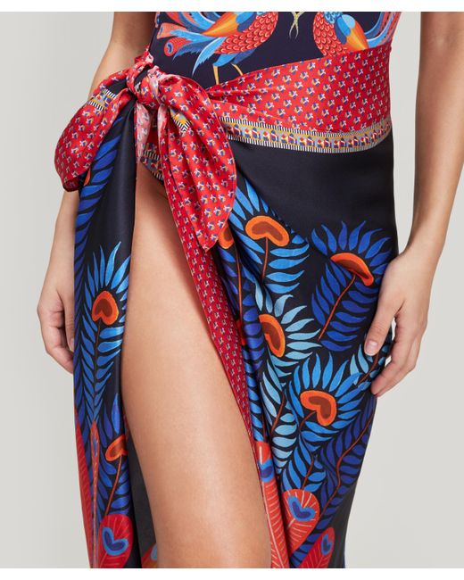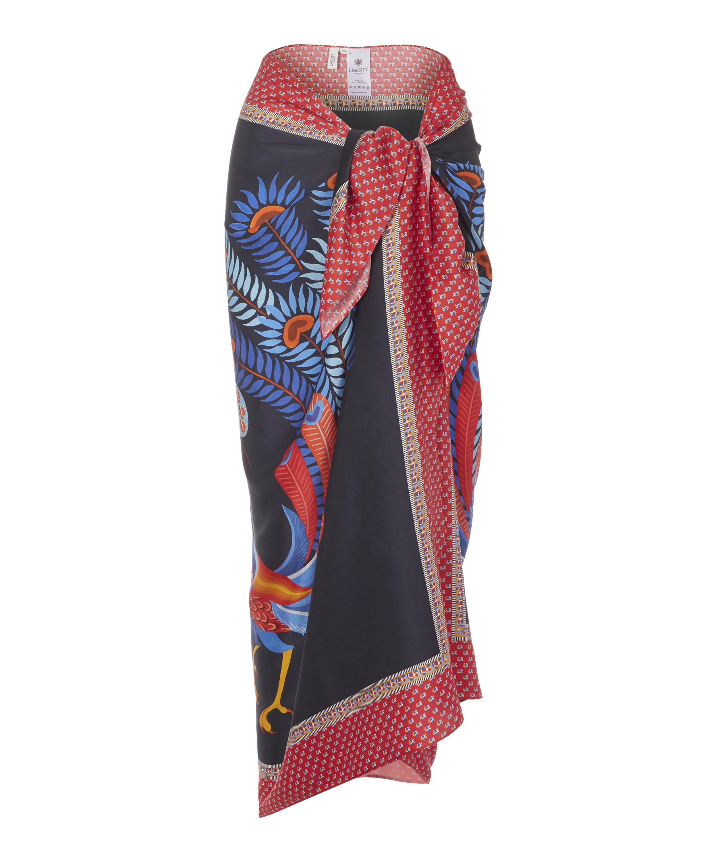 Dauphine sarong. Nylah print. Made in Portugal. Dry clean only. 16mm sandwashed silk. 100% Silk. W: 111cm, L: 147cm. Model is 162cm/5'4" and wears size S. Liberty London's Dauphine sarong is our largest scarf style yet – designed by the in-house Liberty studio team, it is crafted from sandwashed silk and printed with our Nylah design. This sarong exudes beachside cool – it's crafted from relaxed sandwashed silk, with a beautiful matte sheen and a perfectly soft handfeel. The silken surface is printed with our Nylah print – drawn from a single element within the studio-painted Mina print, Nylah features a mirrored peacock motif with a lushly ornate border. Tie the sarong as a maxi-skirt or halter-neck dress as the perfect poolside cover-up. Colour: blue