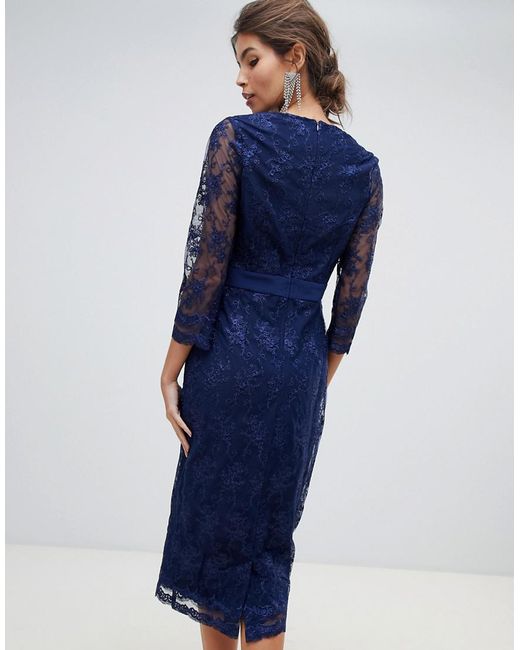 Women's Blue Sheer Mid Length Sleeve Embroidered Mesh Pencil Dress With Scallop Edging Ves.