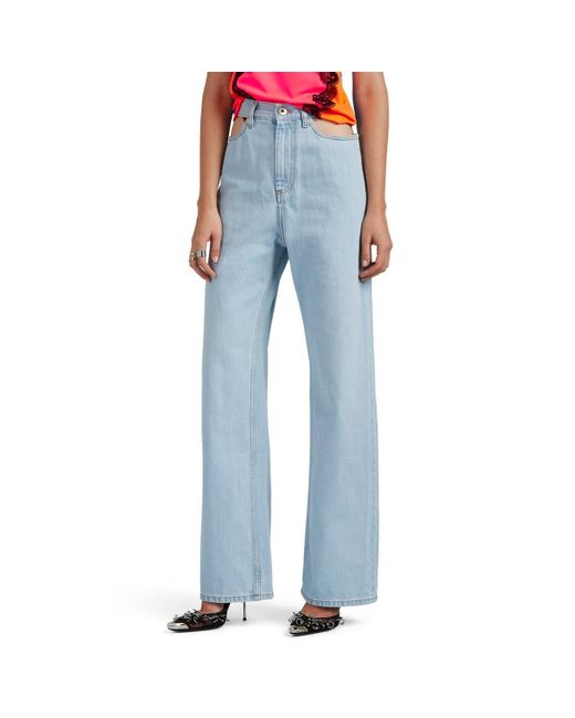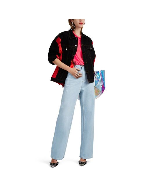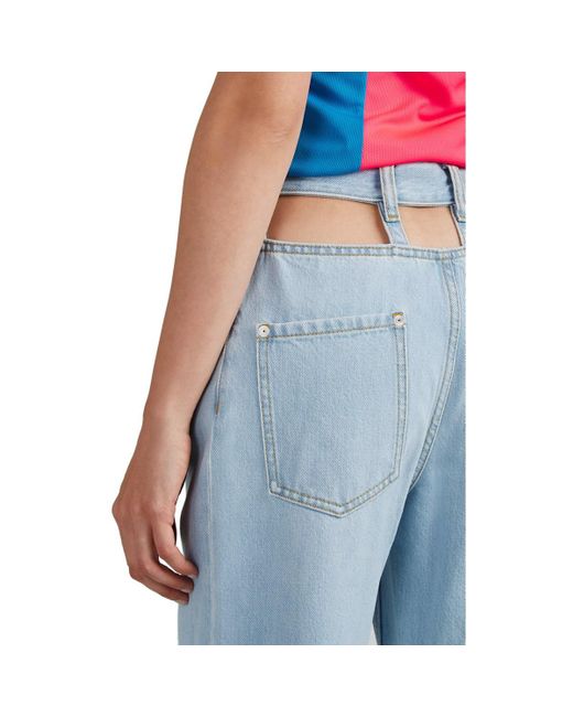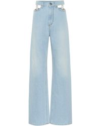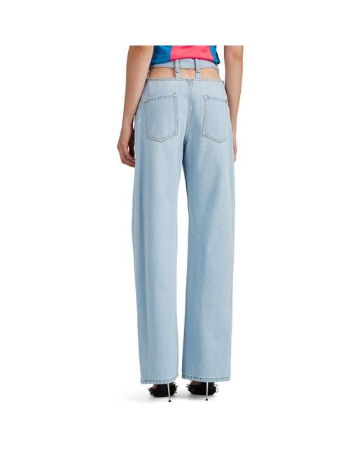 Maison Margiela's wide-leg jeans are cut from light blue cotton denim. Detailed with a cutout back waist and sides, this pair references the avant-garde approach of the French house. Signature white basting stitches at back. Sits above waist. Relaxed through hips and thighs. Two patch back pockets. Belt loops. Cutout sides and back waist. Marigold topstitching. Silvertone hardware. Zip fly. Button closure. 100% cotton. Pocket lining: 100% cotton. Machine wash. Made in Italy. Maison Margiela Women's Cutout Wide-Leg Jeans - Lt. Blue Size 42 IT A great designer gift. Shop Maison Margiela at Barneys New York. Colour: blue