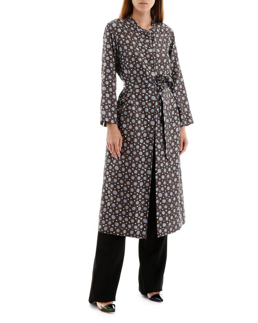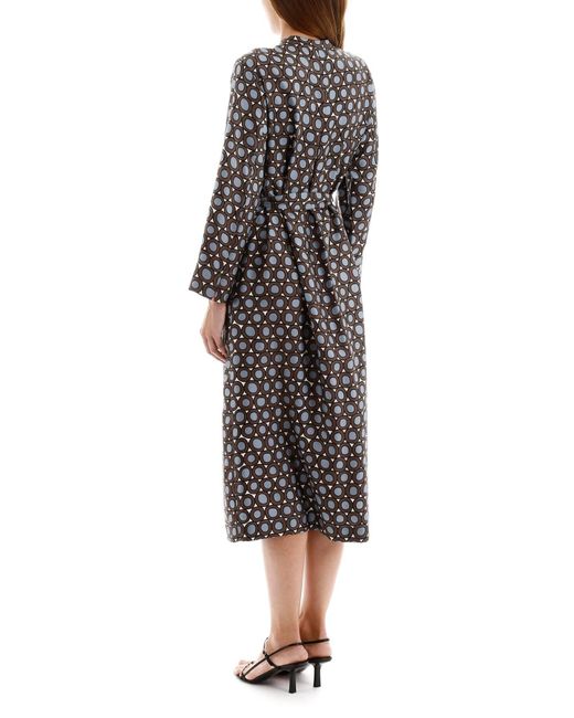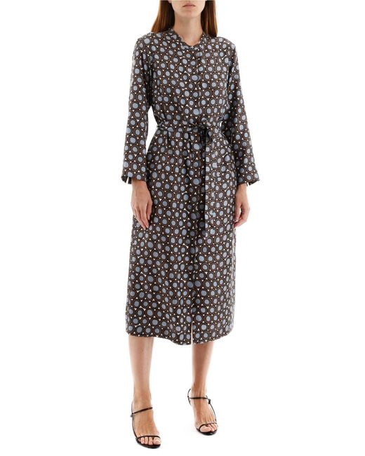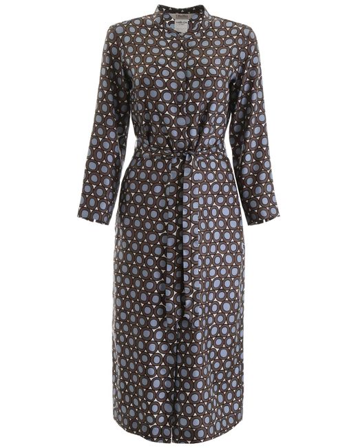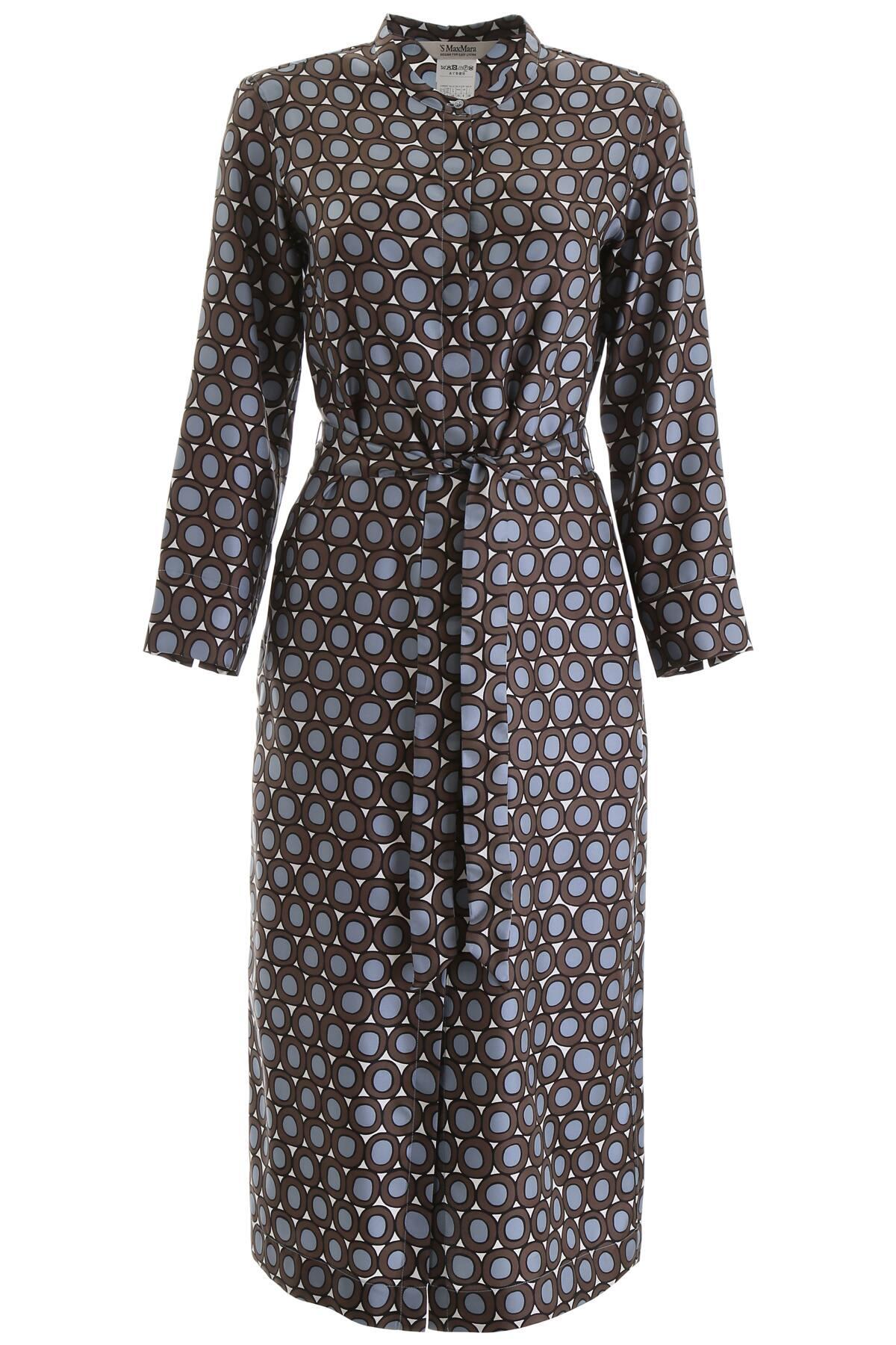S Max Mara silk twill dress with all-over "circle" print. It features side pockets, concealed button closure, mandarin collar, self-tie waist belt. Model height is 177 cm and she is wearing a size IT 38. Colour: blue