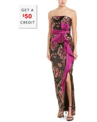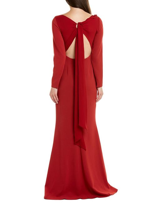 Color/pattern: ruby. Approximately 63in from shoulder to hem. Measurement was taken from a size 4 and may vary slightly by size. Model is 5ft 10in. Design details: keyhole front, chiffon back panel with self-tie straps and O-ring detail, open back. Center back zipper with hook-and-eye closure. Self: 100% silk. Contrast: 70% triacetate, 30% polyester. Lining: 89% acetate, 6% silk, 5% nylon. Dry clean only. Made in Italy.