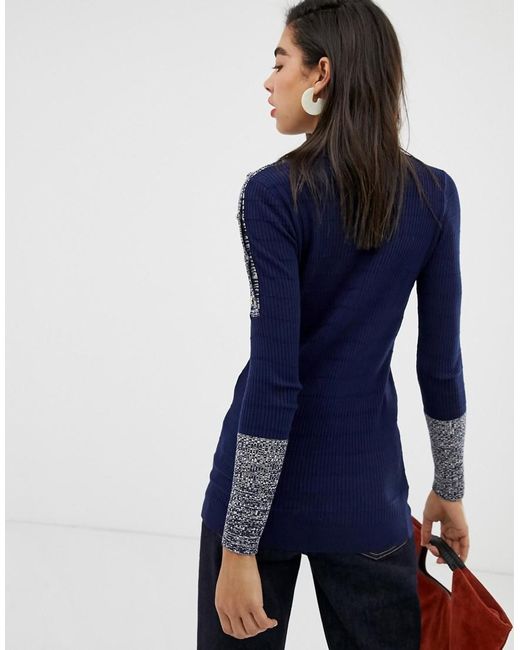 Women's Blue Contrast Cuff Roll Neck Jumper