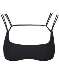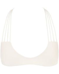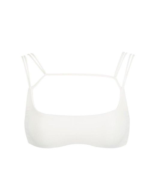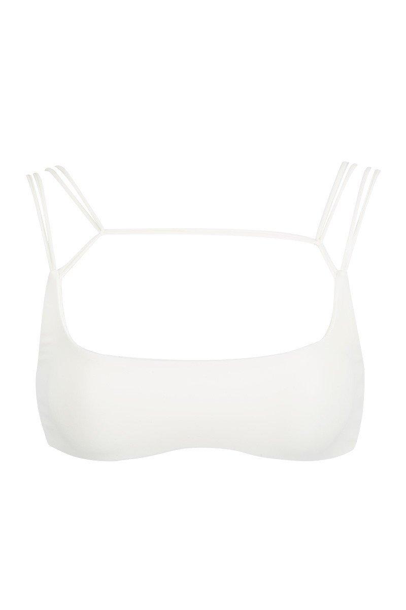 STYLE: Strappy bandeau style bikini top in bone white. Multi-strap design at the front frames your collarbones for an ultra flattering look. On-trend square neckline exposes your décolletage and some cleavage. Wide back band provides extra support for your bust. Seamless and hardware-free, this bikini top is perfect for all-day, fuss-free wear. Double lined fabric ensures opacity and provides a comfortable, supportive fit. As seen on Whitney Port. Pair with the MIKOH Lahaina bikini bottom in bone. MIKOH runs small, so we recommend sizing up in this style. CARE: Hand wash in cold water with gentle detergent and lay flat to air dry. 80% nylon, 20% spandex. Colour: white