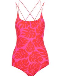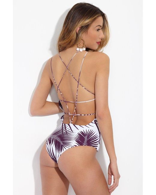 STYLE: Scoop neck strappy one piece swimsuit in deep wine palm print. Multi-string shoulder straps meet at the back in a strappy crisscross design. Mid-rise leg cut elongates your legs while keeping you stylishly modest. Seamless and hardware-free, this one piece swimsuit is perfect for all-day, fuss-free wear. Double lined fabric ensures opacity and provides a comfortable, supportive fit. Moderate rear cut shows off your curves while providing cheeky coverage. MIKOH runs small, so we recommend sizing up in this style. CARE: Hand wash in cold water with gentle detergent and lay flat to air dry. 80% nylon, 20% spandex. Colour: purple
