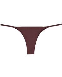STYLE: Low-rise strappy cheeky bikini bottom in deep wine purple palm print. Delicately accented with a knotted string side detail to show some skin at the hips. Low rise cut and minimal coverage leave less noticeable tan lines. Seamless and hardware-free, this bikini bottom is perfect for all-day, fuss-free wear. Double lined fabric ensures opacity and provides a comfortable, supportive fit. Moderate rear cut shows off your curves while providing cheeky coverage. Pair with the MIKOH Kirra bikini top in botanical wine. MIKOH runs small, so we recommend sizing up in this style. CARE: Hand wash in cold water with gentle detergent and lay flat to air dry. 80% nylon, 20% spandex. Colour: purple
