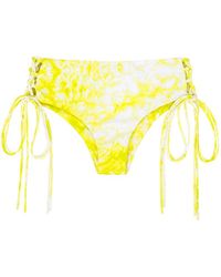 STYLE: Lace-up sides cheeky boy short bikini bottom in vibrant blue tie-dye water print. The double lined fabric ensures opacity and provides a comfortable, supportive fit. Lace-up sides add a sexy criss-cross detail across your hips and long tassel-like knots that sweep down your thighs. Thick sides create a sporty boy short silhouette that you can take on all your adventures. Low rise front elongates your torso while the cheeky backside shows off your curves. Pair these bottoms with the Namotu Stringy Halter Bikini Top. MIKOH runs small, so we recommend sizing up in this style. CARE: Hand wash in cold water with gentle detergent and lay flat to air dry. 80% nylon, 20% spandex. Made in Bali. Colour: blue