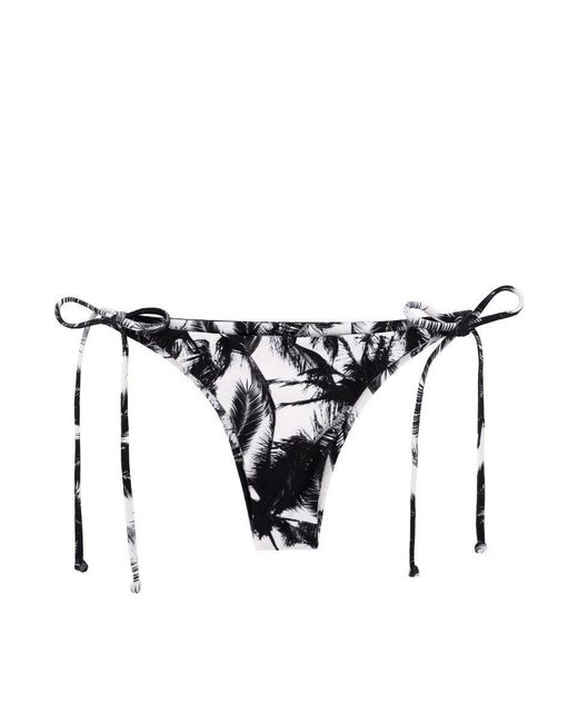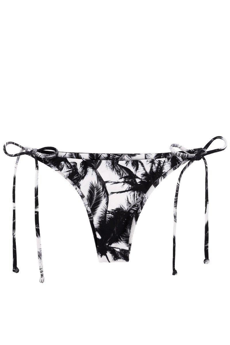 STYLE: Tie side Brazilian bikini bottom in black and white tropical palm leaf print. The double lined fabric ensures opacity and provides a comfortable, supportive fit. Low rise front elongates your torso while the Brazilian backside shows off your curves. Classic thin tie sides offer minimal coverage for those long tanning days. Adjustable sides allow you to find your perfect fit. Pair these bottoms with the Hilo Cut Out Knot Bikini Top. MIKOH runs small, so we recommend sizing up in this style. CARE: Hand wash in cold water with gentle detergent and lay flat to air dry. 80% nylon, 20% spandex. Made in Bali. Colour: multicolour
