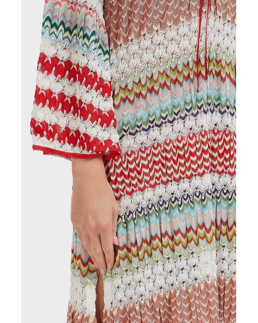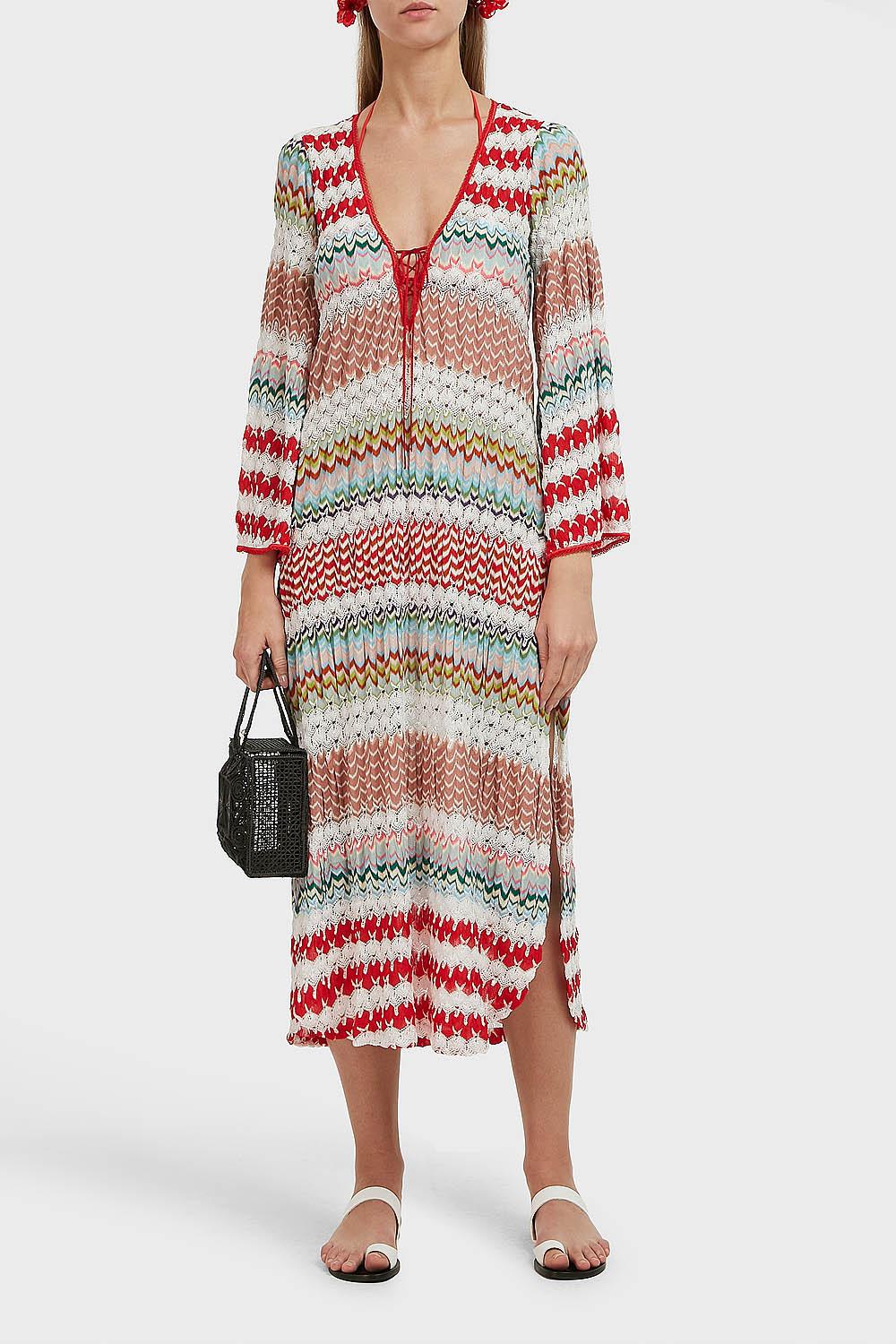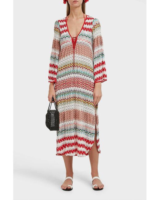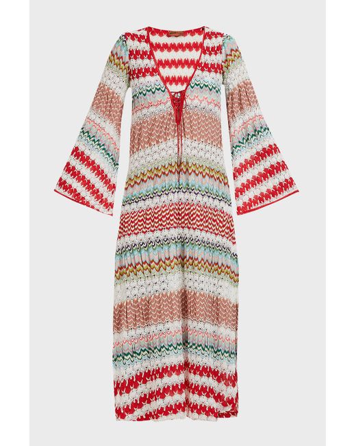 The Missoni 'Dona' Lace-Up Crochet-Knit Kaftan features a vibrant and colourful zigzag pattern. Made from lightweight crochet-knit, it has a plunging neckline and side splits to add an airy feel. Multicoloured Crochet-knit Midi length Side splits Lace ties at the neckline We styled it with ATP Atelier sandals, Silvia Tcherassi bag, and Isabel Marant earrings. Colour: multicolour