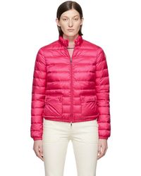 Long sleeve down-filled quilted nylon jacket in navy. Press-stud fastening at stand collar. Two-way zip closure at front. Patch pockets at waist. Elasticized cuffs and hem. Tricolor logo applique at upper sleeve. Logo-engraved tonal and silver-tone hardware. Tonal stitching. Fill: 90% down, 10% feather. Colour: blue