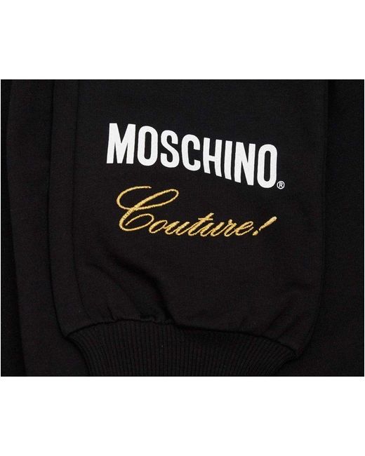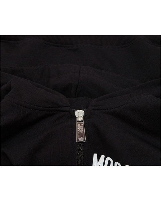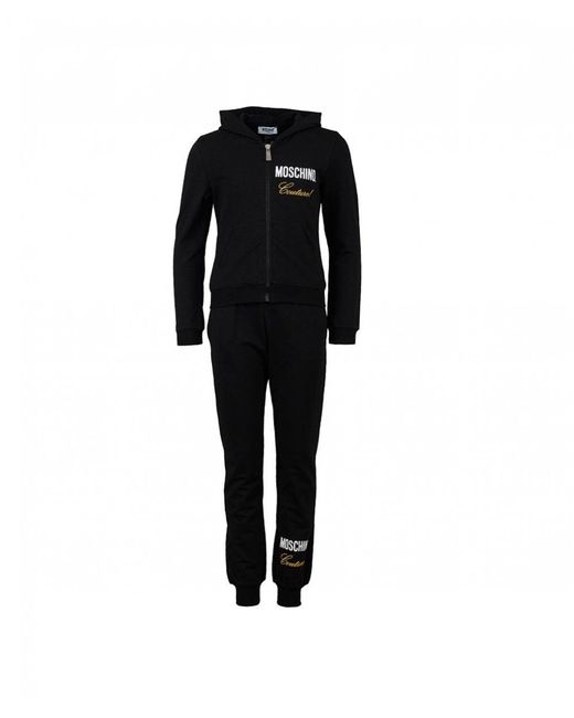 The is a girly update to your little ones after school casuals. Cut from comfortable cotton with stretch, sporting a warming hood, a branded zip fastening, ribbed trims and finished with prints with metallic embroidery detailing. Jacket. 95% cotton 5% elastane. Hooded style. Zip fastening. Moschino print. Embroidered logo. Split kangaroo pockets. Ribbed cuffs & hem. Machine wash. Trousers. Drawcord adjustable waistband. Moschino print to leg. Ribbed cuffs. Size photographed: 10 years. Pit to pit: 16". Rise: 9.5". Inside leg: 26". Colour: black