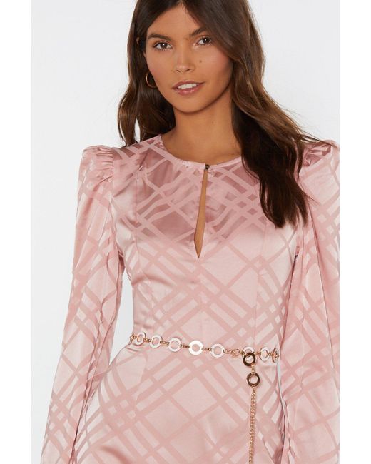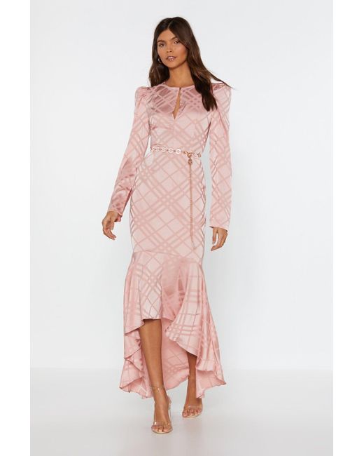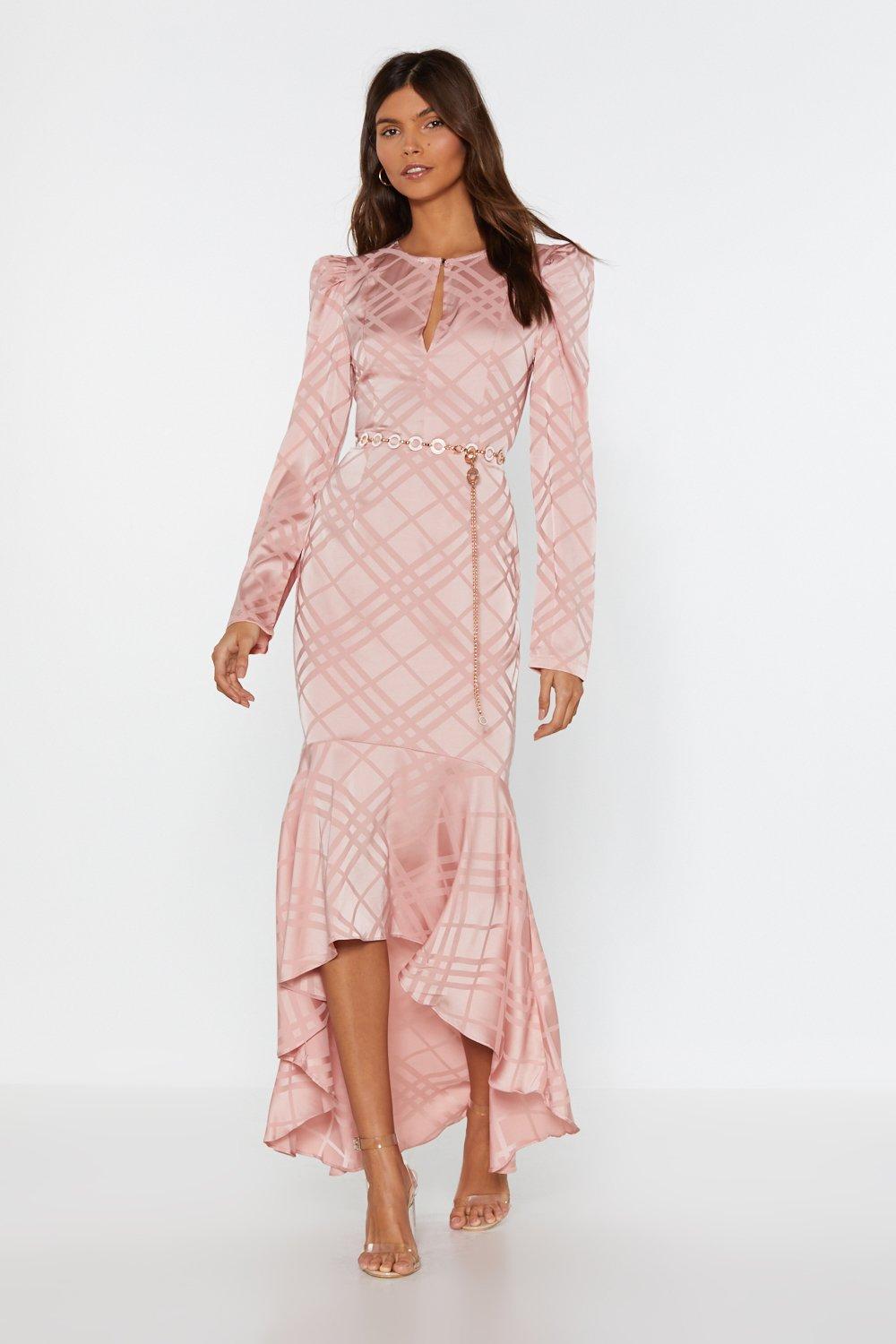 We're flying high. This dress comes in satin and features a midi silhouette, puff shoulders with gathered detailing, crew neckline, keyhole cut-out at bust, jacquard design, zip closure at back, and high-low, ruffle hem. Fabric: 95% Polyester 5% Elastane. We've got you. Delivery info. Colour: pink