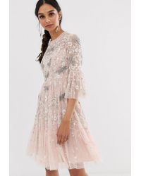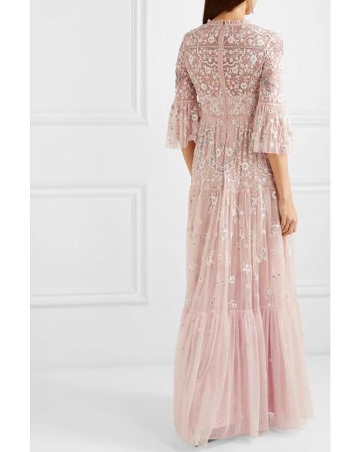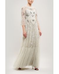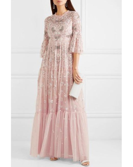 Needle & Thread's gown features so many thoughtful details. The embroidered flowers and beaded dragonflies are inspired by English gardens. It's made from light-pink tulle that's lined for coverage and has fluted cuffs and gently pleated tiers through skirt. Wear it to your next event with neutral sandals. Colour: pink
