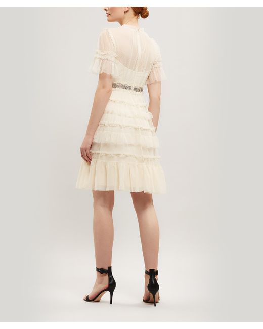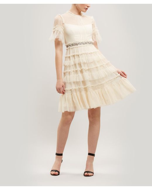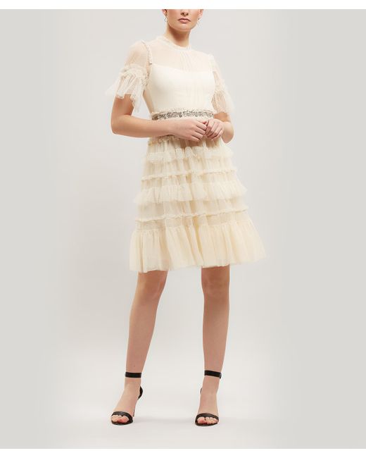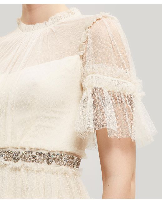 Maxi-dress. Embroidered. Bow embellishment. Ruffled trims. Sheer, flared sleeves. Bead and sequin-encrusted belt. Vintage inspired silhouettes. Hand-embellished. Model is 179cm/5'10" and wears size 10. Please note: Needle & Thread's tailoring comes up small - we advise buying one size up from your usual size. An opulently ruffled dress adorned with bead and sequin-encrusted cloth by Needle & Thread - the British brand that prides itself on having the stand-out piece you need for your next celebration. Needle & Thread create hand-embellished pieces with contemporary tailoring. The Love dress will quickly become the go-to piece to breathe life into your event attire. With the label's ethereal, angelic references clear in the intricate embroidery and layers of frothy pale tulle, this frivolously ruffled dress will be the life and soul of the party. 100% Polyester. Lining: 100% Polyester. Dry clean only. British brand Needle & Thread emerged in 2013, launching with a capsule collection of exquisite hand-embellished dresses that have since become its signature. Beloved for its expertly drawn lace and embroidery, this the go-to brand for a party or celebration. Choose from skirts of tumbling tulle, frivolously ruffled blouses or show stopping, heavily-embellished gowns - all crafted by carefully cultivated artisans in the UK and India. Colour: natural