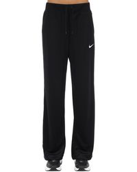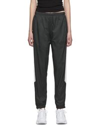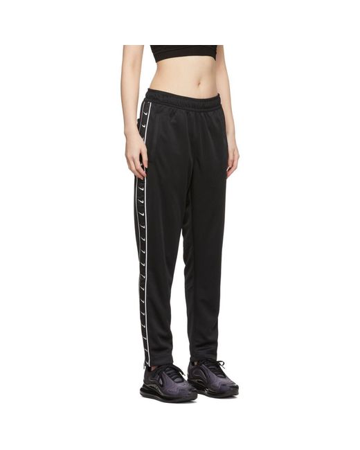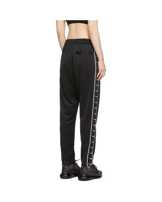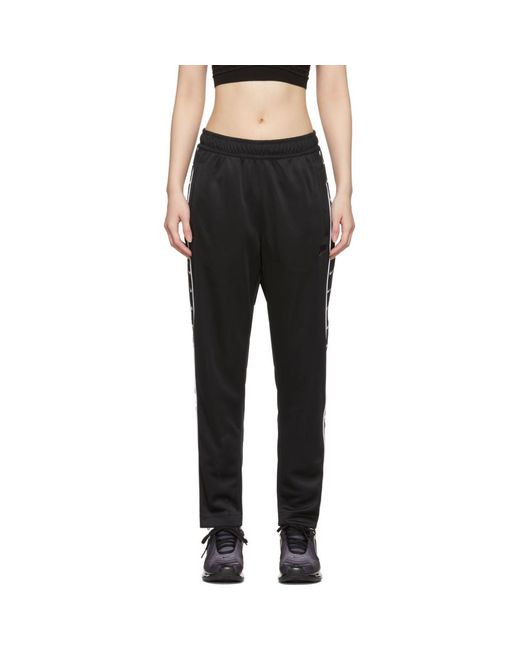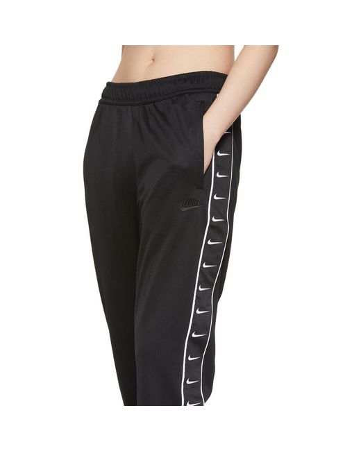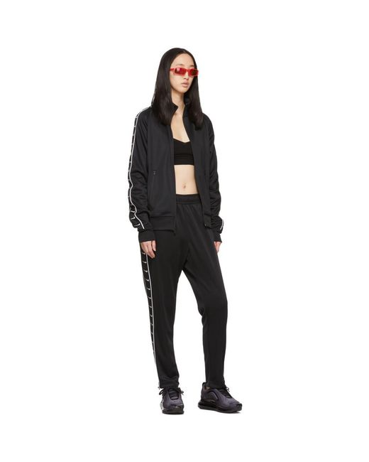 Relaxed-fit technical jersey track trousers in black. Mid-rise. Three-pocket styling. Concealed drawstring at elasticized waistband. Tonal embroidered logo at front. Textile trim featuring piping and Swoosh pattern in white at outseams. Zippered vent at cuffs. Colour: black