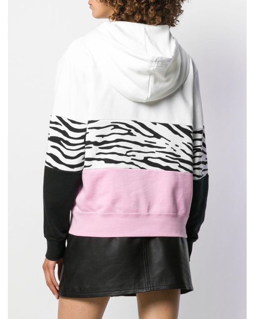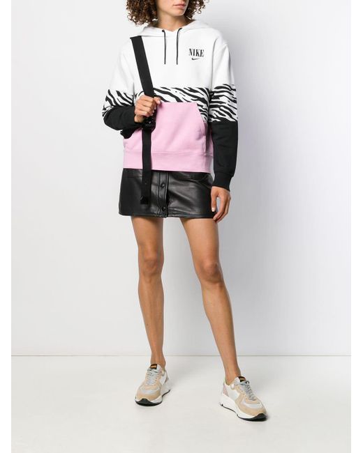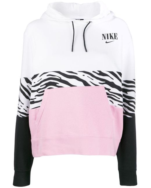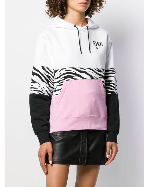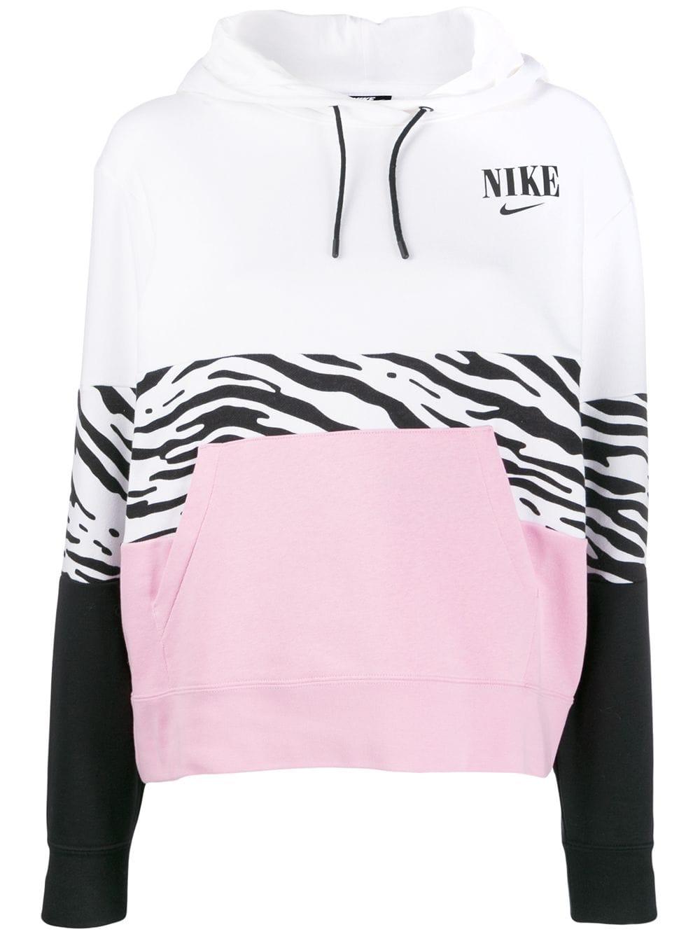 White, pink and black cotton colour block hoodie from Nike featuring a hood with drawstring tie fastenings, dropped shoulders, long sleeves, a zebra pattern, a panelled colour block design and a kangaroo pocket. Material:Cotton/Polyester. Colour: white