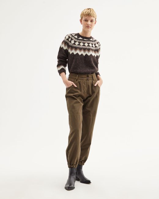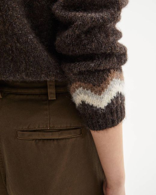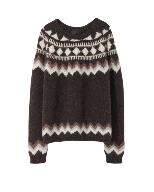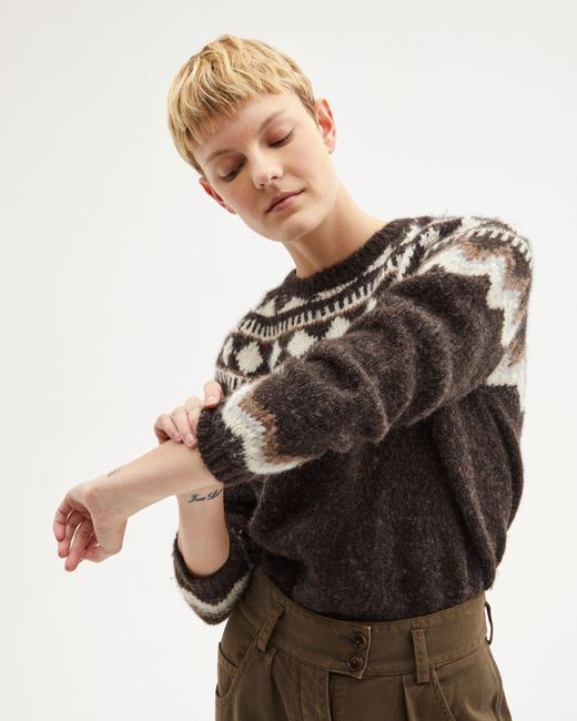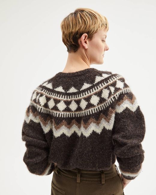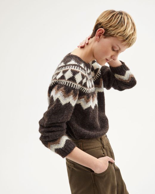 The Adene sweater is designed for a relaxed, cozy fit. It features a banded collar and cuffs, and a classic chocolate fairisle pattern.