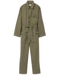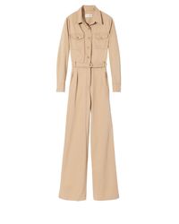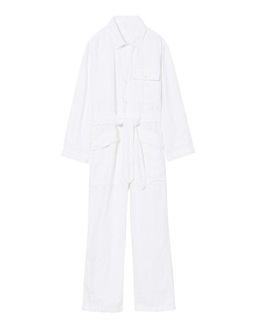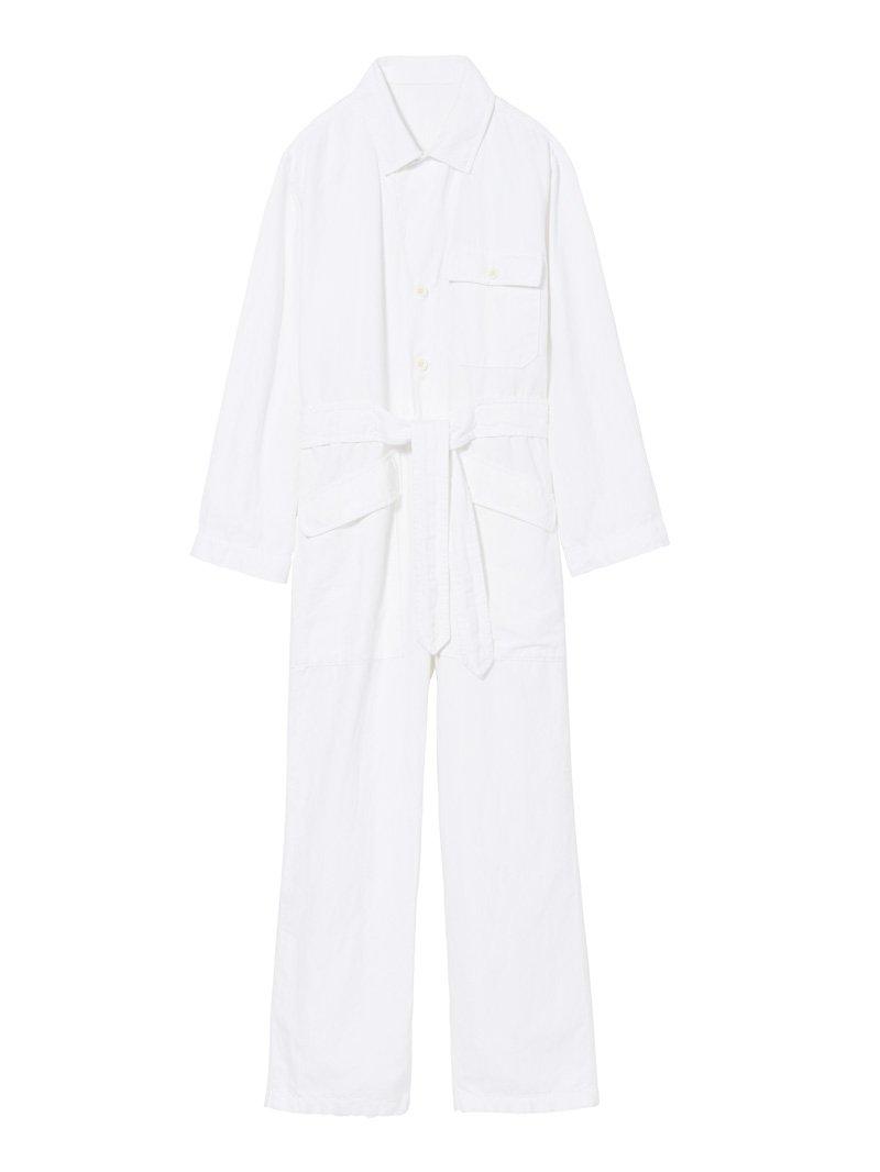 Utilitarian inspired, this jumpsuit was designed for a relaxed yet feminine fit throughout. Stonewashed for a soft hand and vintage feel, it features a self-tie belt, long cuffed sleeves, button placket and utility pockets. Colour: white