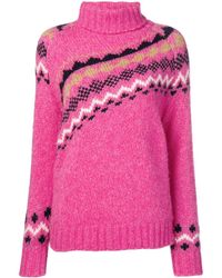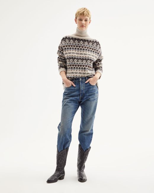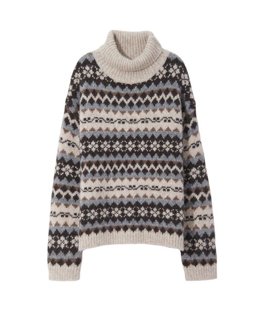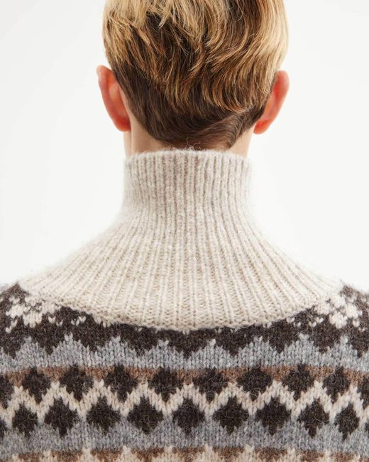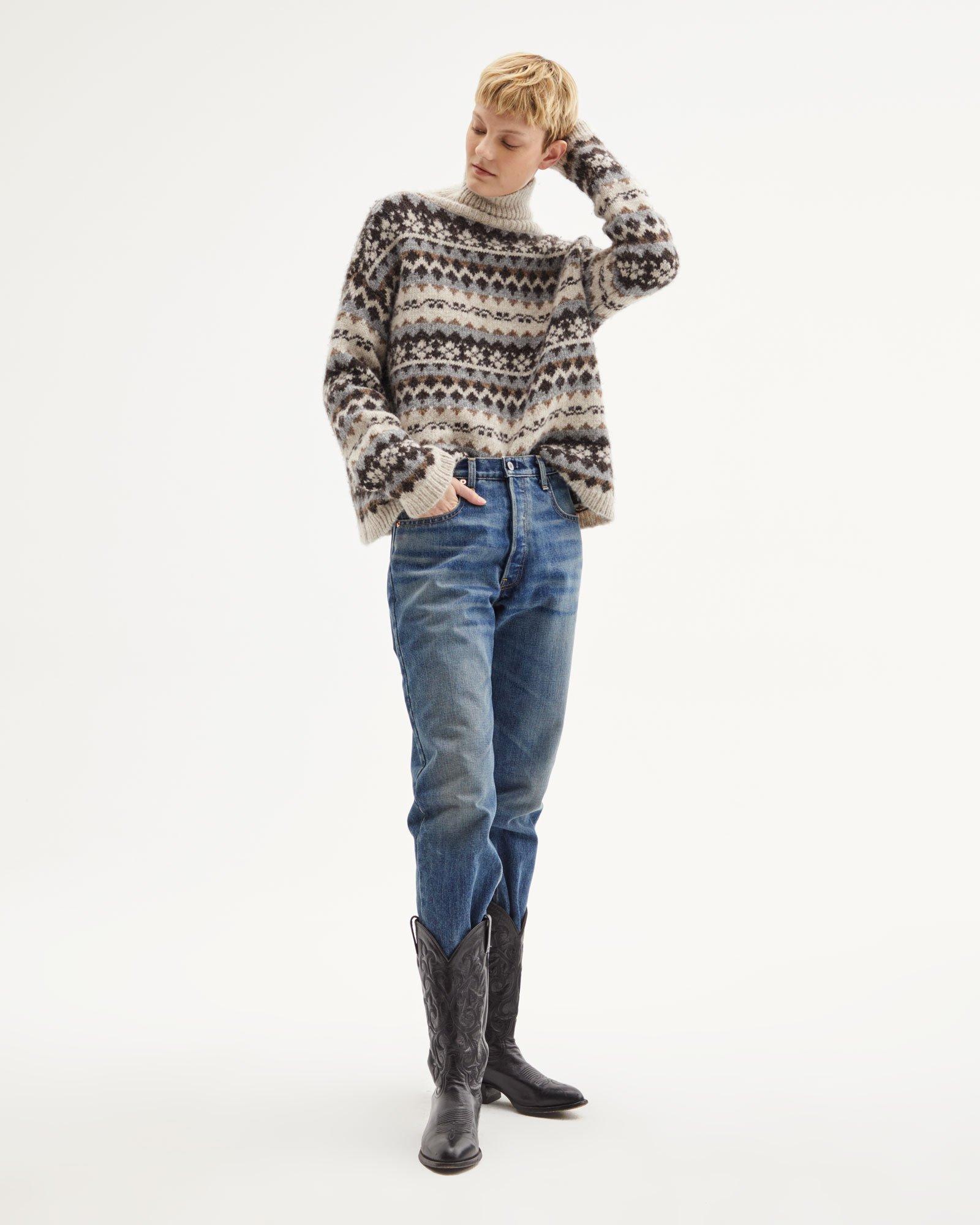 The Catalina jumper was designed for a cosy, relaxed fit. It features a turtleneck collar, ribbed details, and a fairisle knit pattern. Model is 5'10 and wears a size Small / Size Small measures approximately 25" front body length, 46" chest circumference, 19" across shoulders, 20.5" sleeve length. Colour: multicolour
