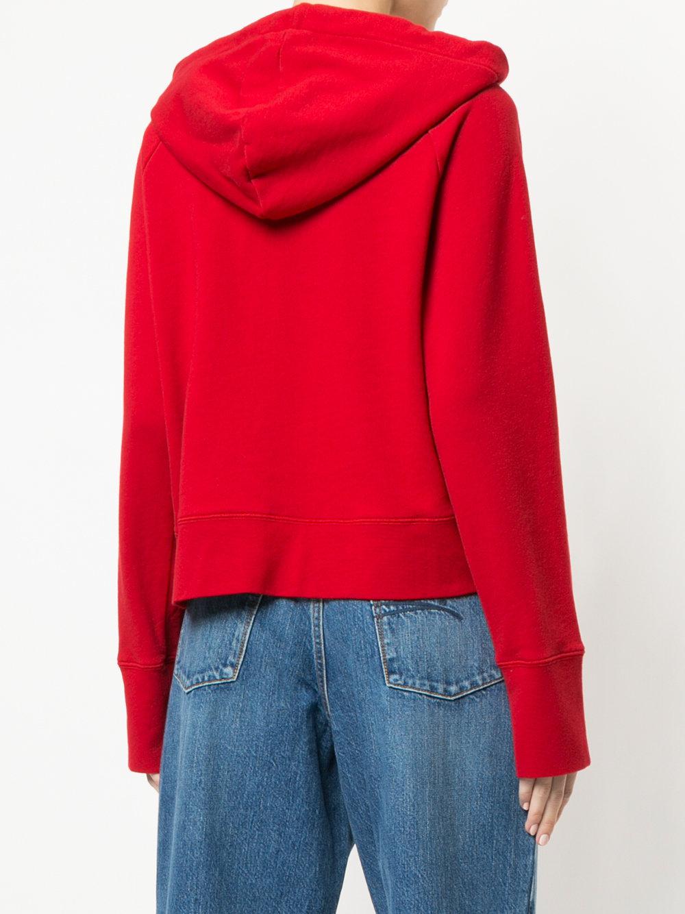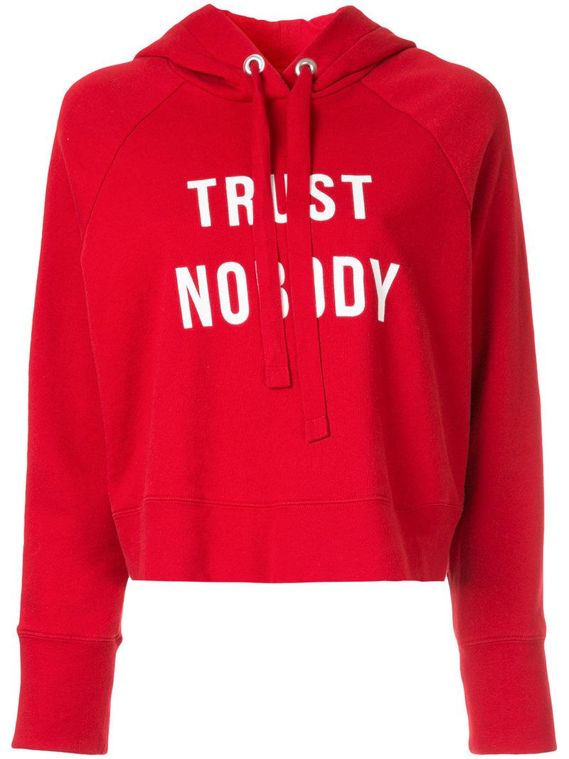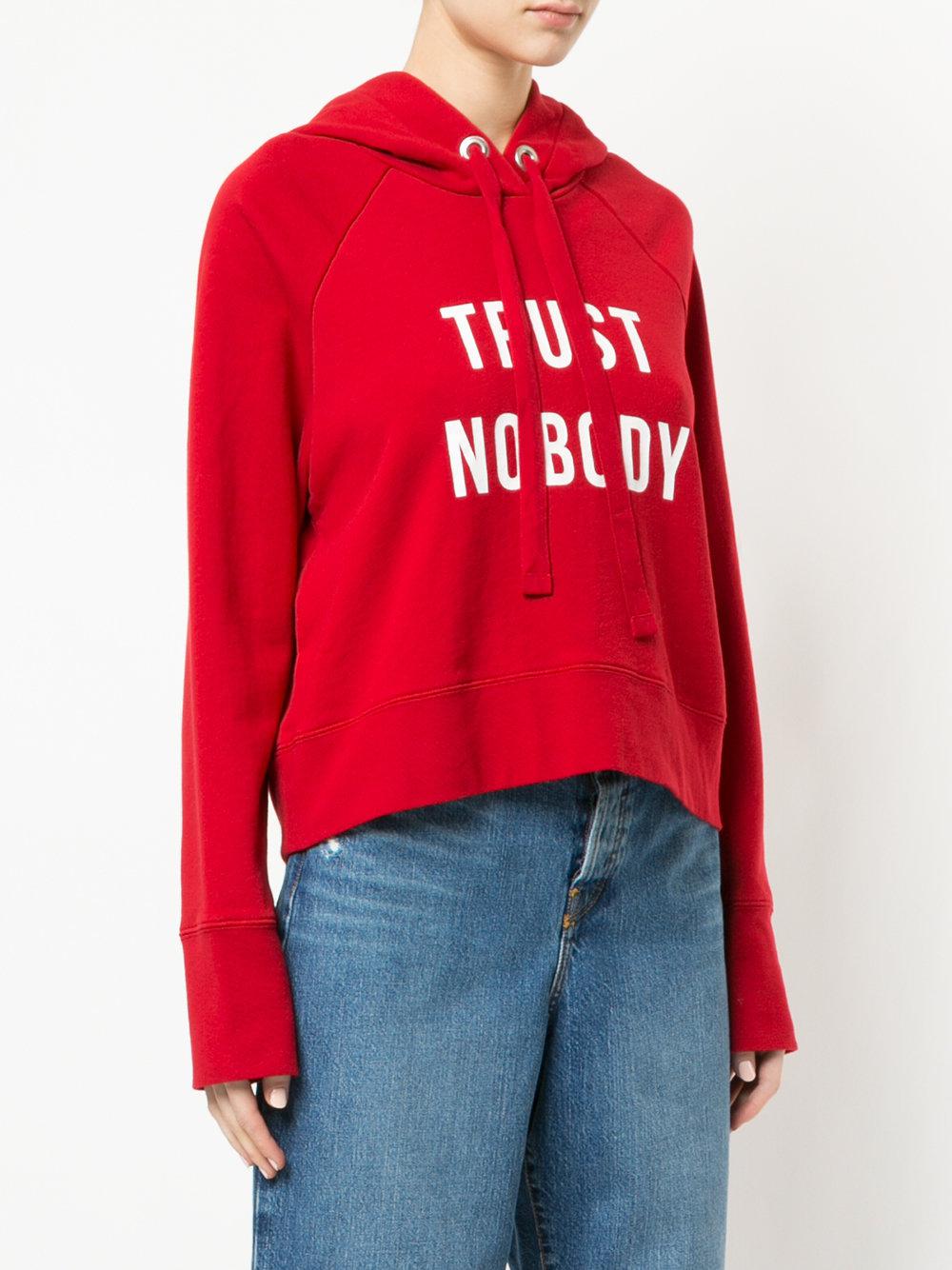 Red cotton Trust Nobody slogan hoodie from Nobody Denim featuring a hood with drawstring tie fastenings, a cropped length, a relaxed fit, long sleeves and a slogan detail. Material:Cotton. Colour: red