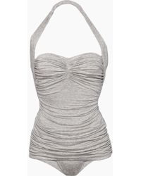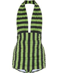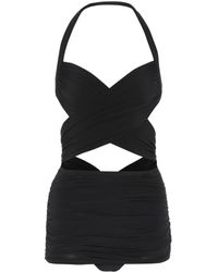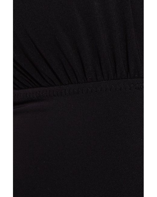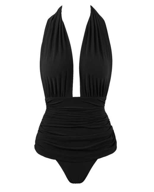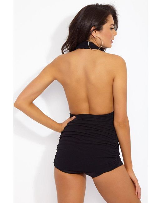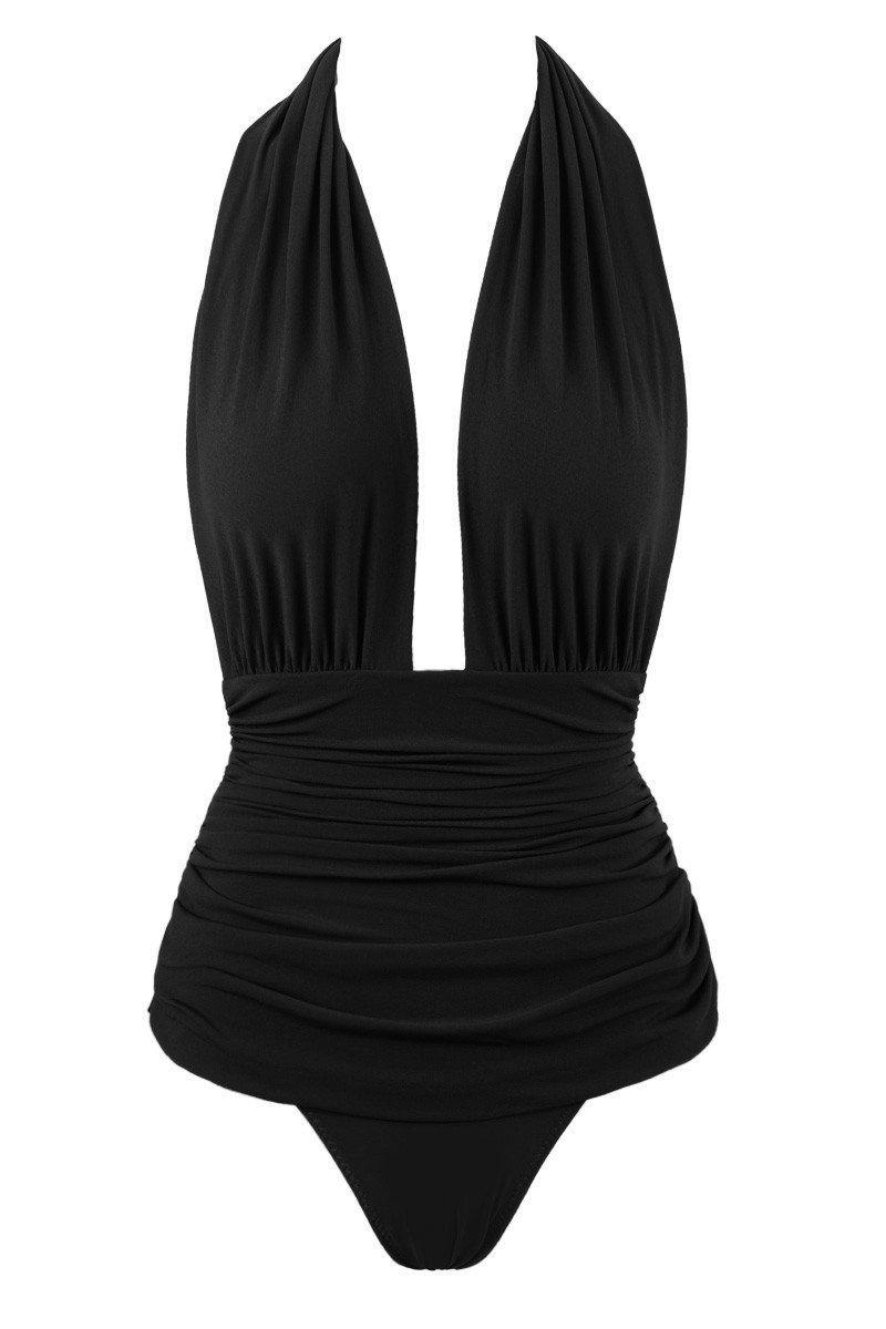 STYLE: Black retro-inspired plunging halter neck full coverage one piece swimsuit. Deep neckline and draped bust flatter your figure while giving the bodysuit an air of the 1950s. All-over shirring and fully ruched hips sculpt and flatter your curves. Thick pull-over halter straps and super low-cut back add to the 50s film star look. Skirt-like panels with low-cut leg and rear give you full coverage throughout. Underlayer of nylon spandex jersey acts as a base and gives you a brilliant form. The luxe Japanese swim jersey fabric is fully lined and wrinkle-free. CARE: Nylon/Spandex Jersey. Hand wash cold and lay flat to dry. Colour: black