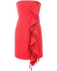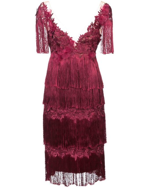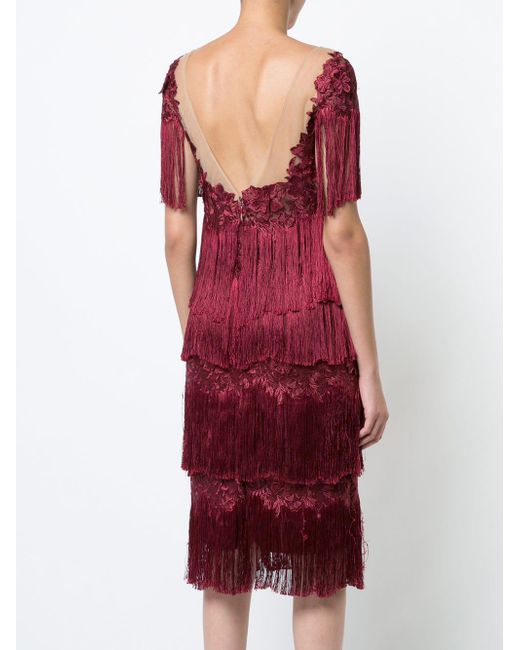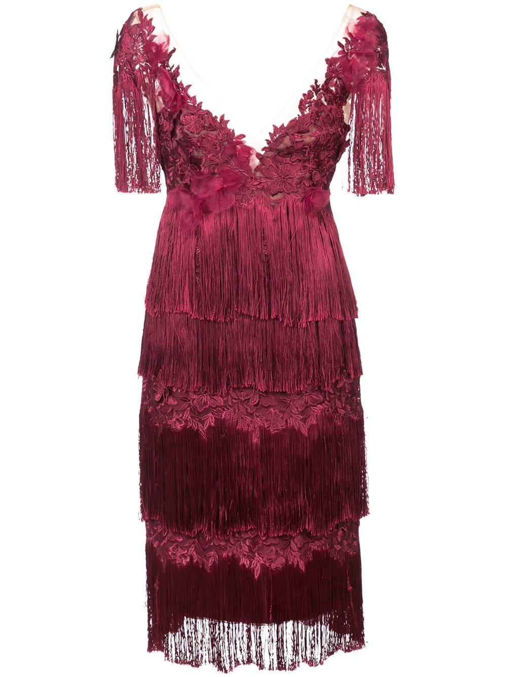 A firm favorite of A-listers including Blake Lively, Rihanna and Jennifer Lopez, Marchesa is sure to effortlessly steal the limelight from every angle, making it a go-to option when special occasions arise. This embroidered and fringed dress from the Marchesa Notte collection is perfect for your next evening event. Presented in a lustful wine red, this dress is characterised by the delicate floral embroidery and fringe detailing across the garment. It also features a deep V neck, a deep V back, a rear zip fastening, short sleeves, a mid-length and a fitted silhouette. Material:Nylon/Polyester. Colour: red