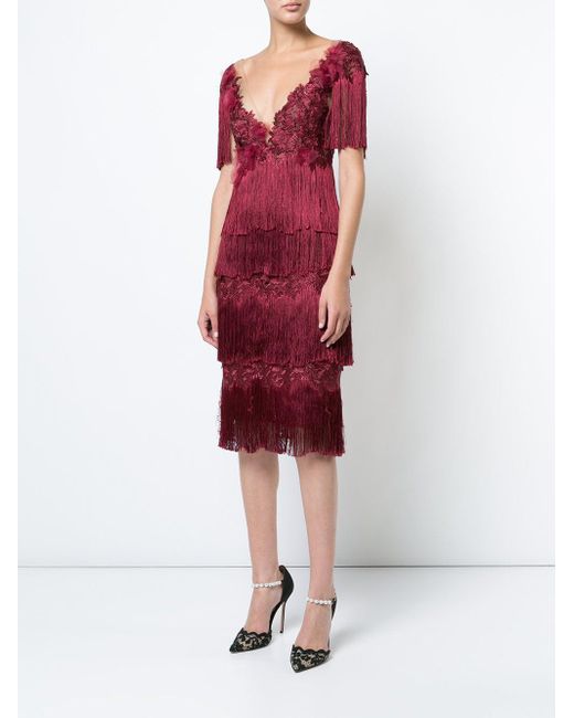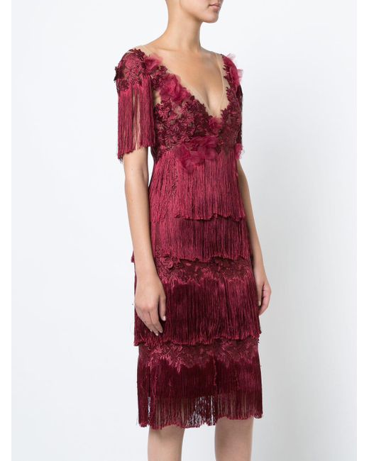 Exclusively ours. Marchesa Notte tiered fringe cocktail dress. Approx. 38.9"L from shoulder to hem. V neckline and back. Short sleeves with fringe. Sheath silhouette. Knee-length hem. Hidden back zip. Polyester. Imported.