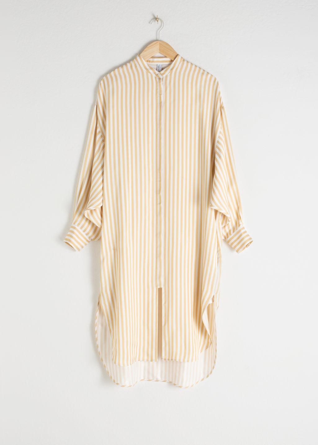Midi length kaftan in a striped patern with a hidden front button placket, mandarin collar and curved side slit hem. Button cuffsShirt dress silhouetteLength of kaftan: 119cm / 46.8" (size S) Model wears: S. Colour: natural