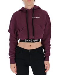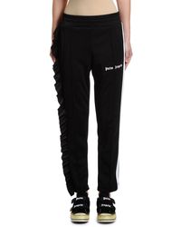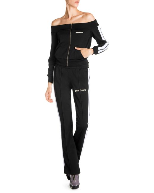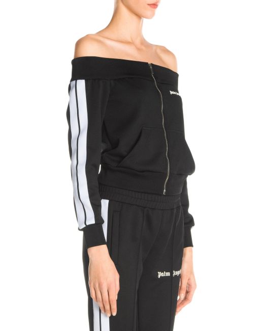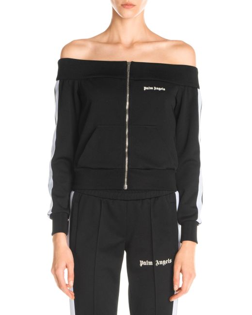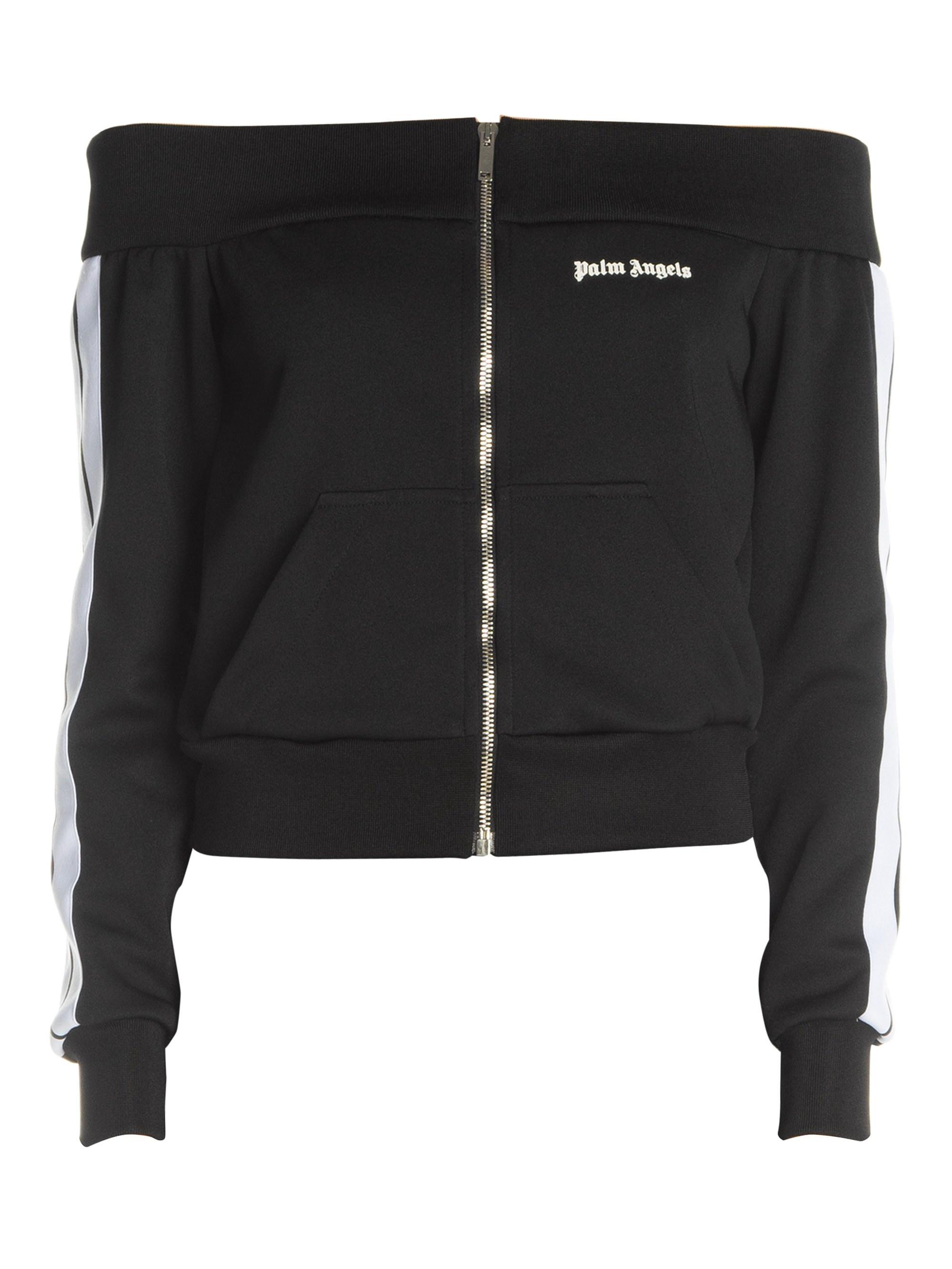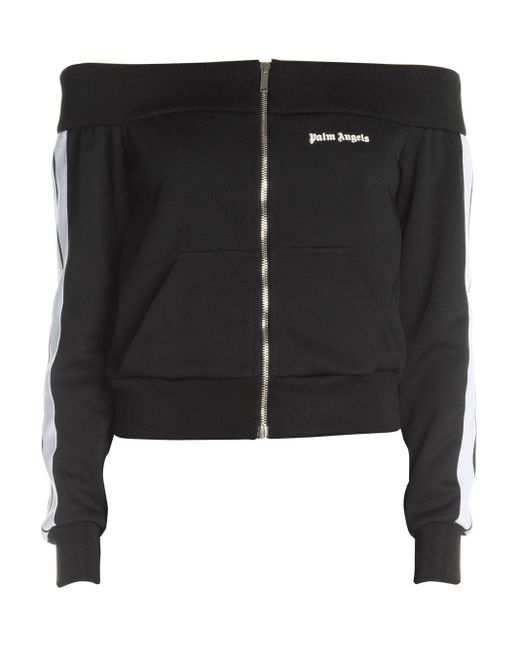 Palm Angels track jacket with contrast side stripes. Chest logo detail. Off-the-shoulder neckline; zip front. Long sleeves. Kangaroo pockets. Relaxed fit. Polyester; rib, polyester/spandex. Machine wash. Made in Italy. Colour: black