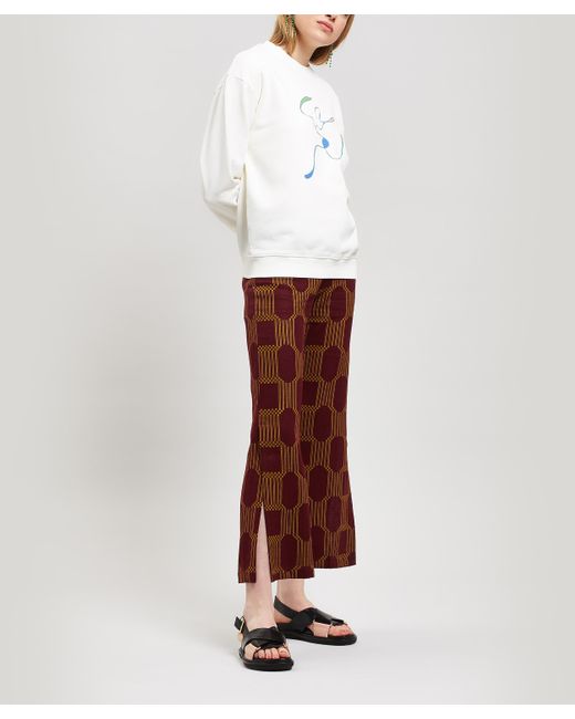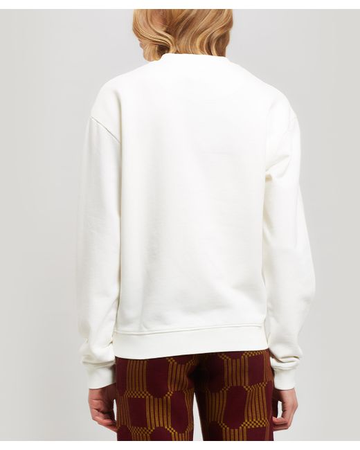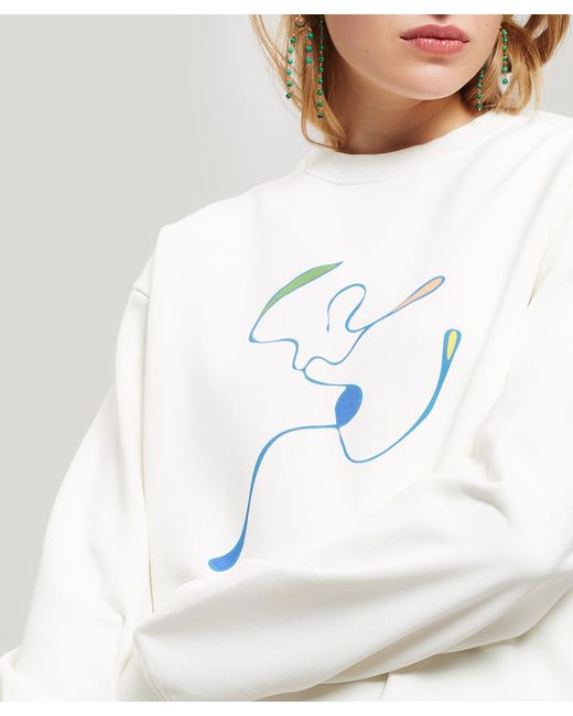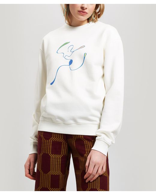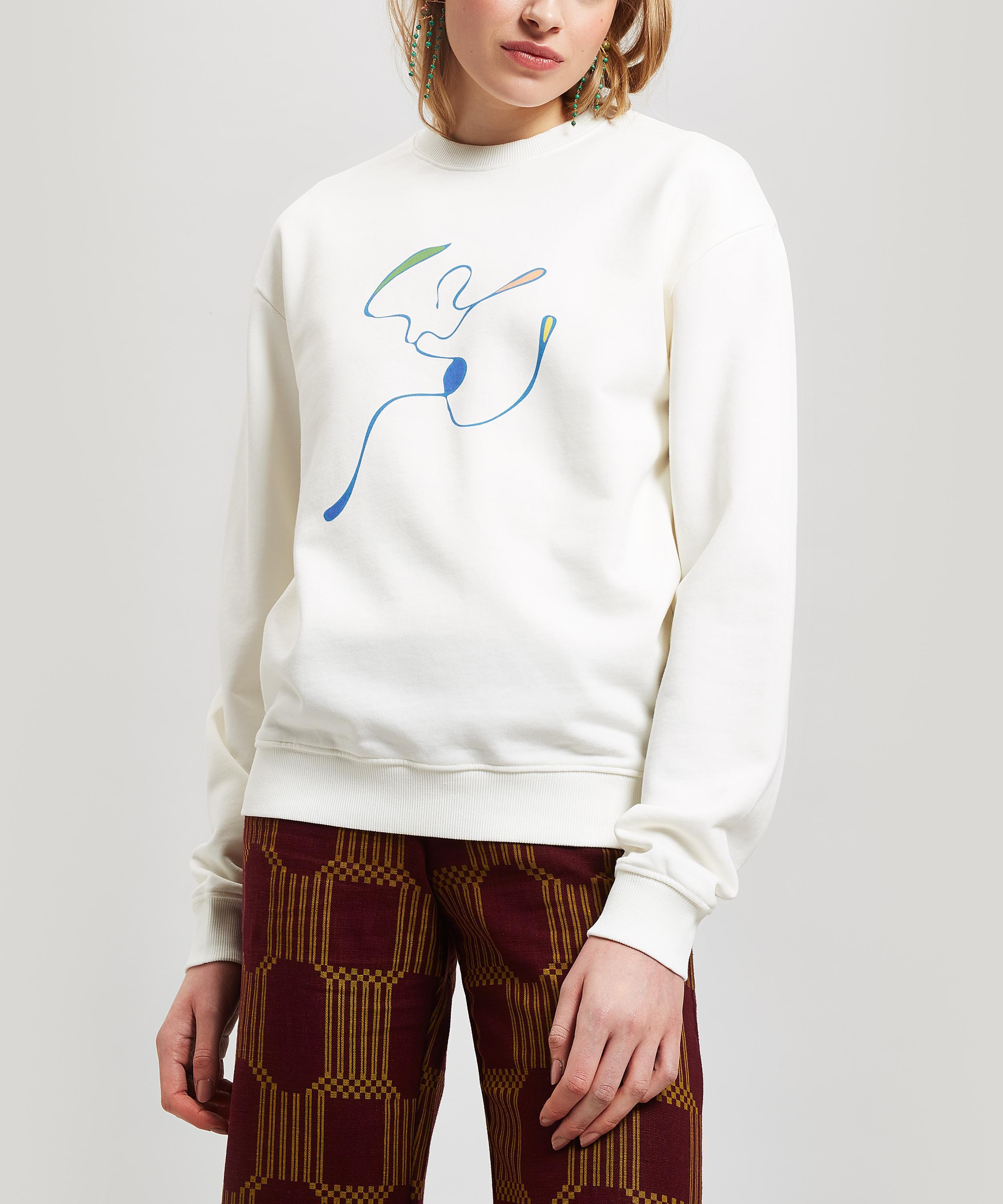 Sweatshirt. Printed with 'paloma wool'. Printed with sketch by artist Tana Latorre. Crew-neck. Relaxed fit. Cotton-blend cloth. Ribbed trims. Made in Portugal. Model is 180cm/5'10"and wears size S. Please note: Paloma Wool's tailoring comes up small - we advise buying one size up from your usual size. The Hotel Currito jumper is a breezy stretch-cotton cover-up printed with the 'paloma wool' brand name and an abstract sketch - crafted in Portugal by oft-lauded Barcelona-based label Paloma Wool. Paloma Wool has quickly become an instantly-recognisable force in the fashion industry. Beloved by industry veterans and newbies alike, the washed-out aesthetic with hints of '70s hues and '90s tailoring has become synonymous with the label. The Hotel Currito cotton-blend jumper is printed at the chest with the brand's name, along with a sketch by Nairobi-born artist Tana Latorre. The relaxed, loose fit is highly adaptable - try layering over a silk slip dress or French-tucking into high-waist joggers. This charming jumper will lend a nonchalant feel to whatever you're wearing and wherever you are. 99% Cotton; 1% Elastane. Machine washable. Paloma Wool began life as the personal project of Barcelona-based aesthete and artist Paloma Lanna. As an investigation into the act of getting dressed, Lanna creates limited-edition capsule collections alongside complimentary series of photographs. Paloma Wool's aesthetic code is distinct and consistent, spreading like wild fire to gain cult status. Explore the label's sketch-adorned shirts, dusky hued knits and textured, minimal tailoring. Colour: white