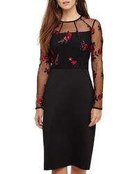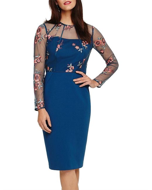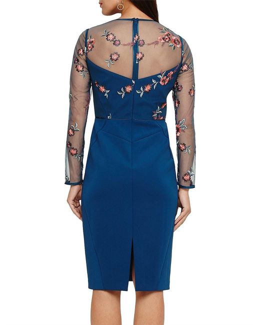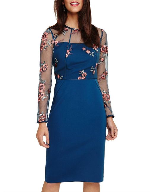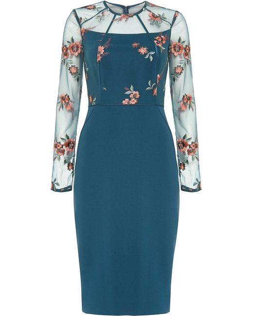 Featuring intricate embroidery and a semi-sheer bodice layer with elegant long sleeves this is a stunning style that's perfect for special occasions. Finished with flattering piping this fitted dress falls below the knee and fastens with an exposed centre back zip. Model Wears wears UK size 10 and is 5'10"/178cm tall. Embellished. Dry Clean. 108cm Shoulder Neck Point To Hem. Shift Dress. Below The Knee. Long Sleeve. Round Neck. 90% Polyester 10% Nylon Knitted Lining: 100% Polyester. Colour: blue