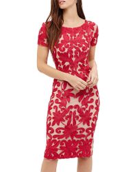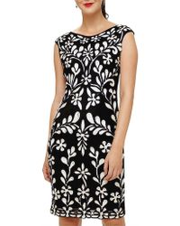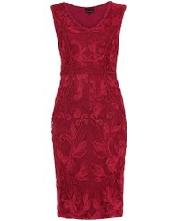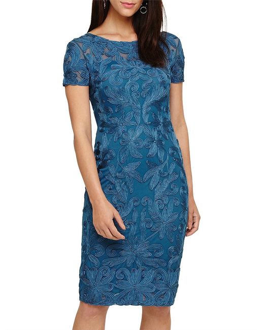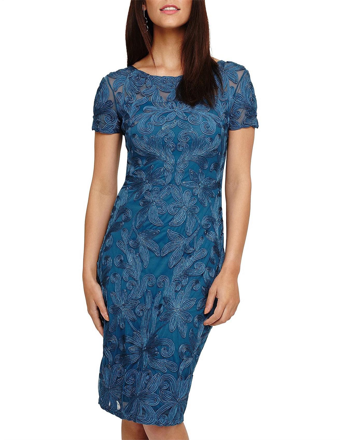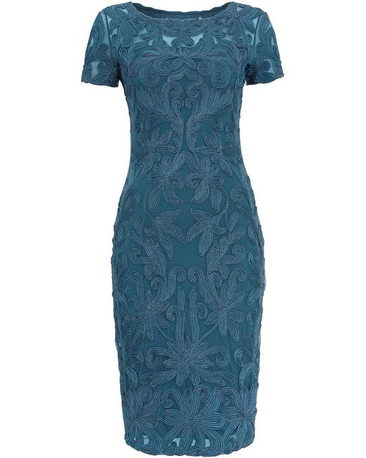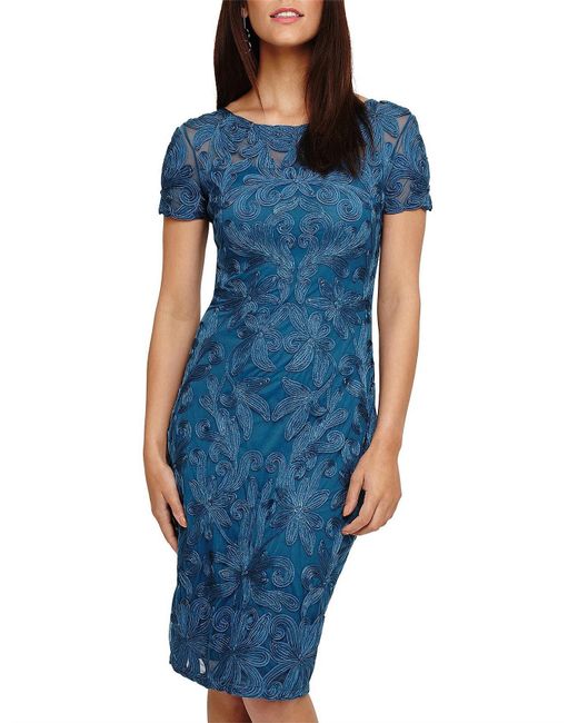 With Phase Eight signature lace tapework detailing throughout this fitted dress is a stand-out style for special occasions. It is fully lined and finished with a semi-sheer neckilne and sleeves. Model Wears wears UK size 10 and is 5'10"/178cm tall. Dress Style Shift Dress. Neckline Round neck. Sleeve Short sleeve. Length 102cm shoulder neck point to hem. 90% Nylon 10% Elastane Knitted Lining: 100% Viscose. Embellished. Colour: blue