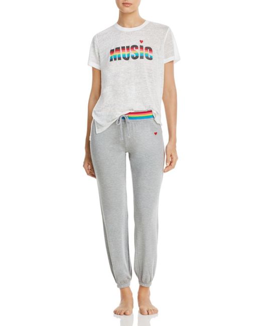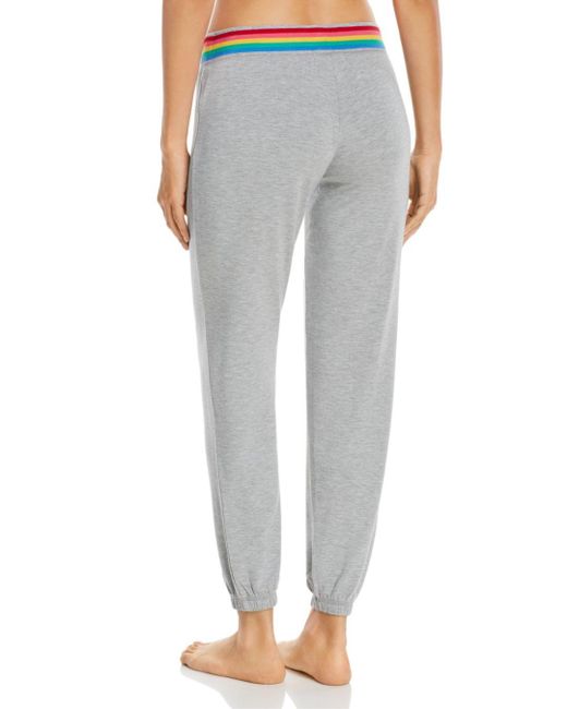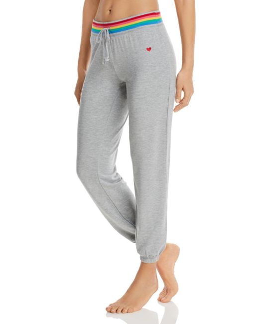 Fits true to size, order your normal size. 29.5" inseam, 9" rise, based on a size small. Model measurements: 5'10" height, 33.5" bust, 23.5" waist, 34.5" hips, wearing a size small. Elasticized rainbow-stripe waistband with drawstring. Embroidered heart at him. Elasticized jogger-style cuffs. 95% rayon/5% elastane. Machine wash. Colour: grey