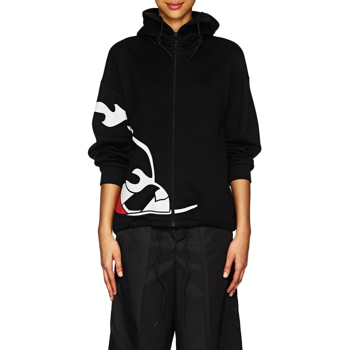 Go to Barneys New YorkThis style is part of thedropLA, a limited-edition collection of elevated pieces from the most coveted labels around the world. Composed of black cotton-blend jersey, Prada's oversized hoodie showcases a red and white signature flame-back-wedge-sandal graphic. The sporty style is finished with a drawstring hem. From thedropLA capsule collection. Hood. Drop shoulders. Long sleeves. Banded cuffs. Side on-seam pockets. Drawstring hem. Black shiny logo-engraved hardware. Zip-front closure. 62% cotton, 38% nylon. Dry clean. Made in Italy. Colour: black