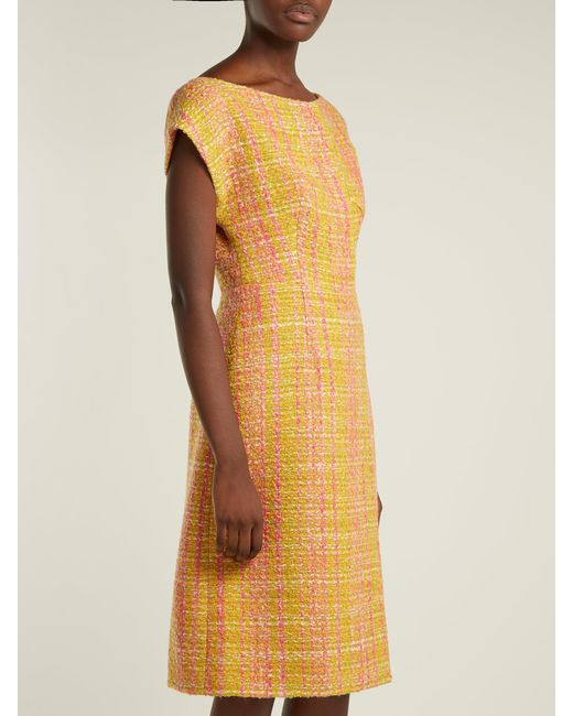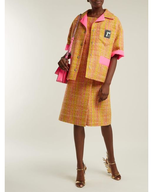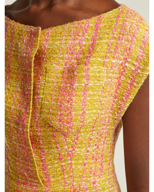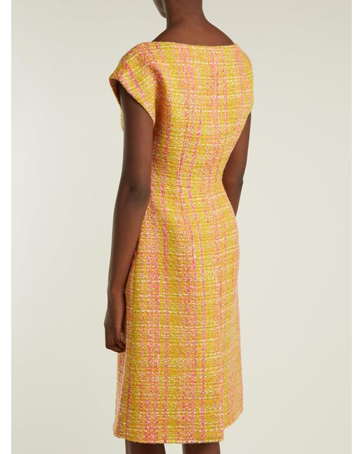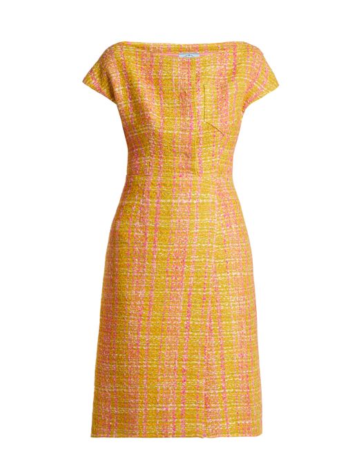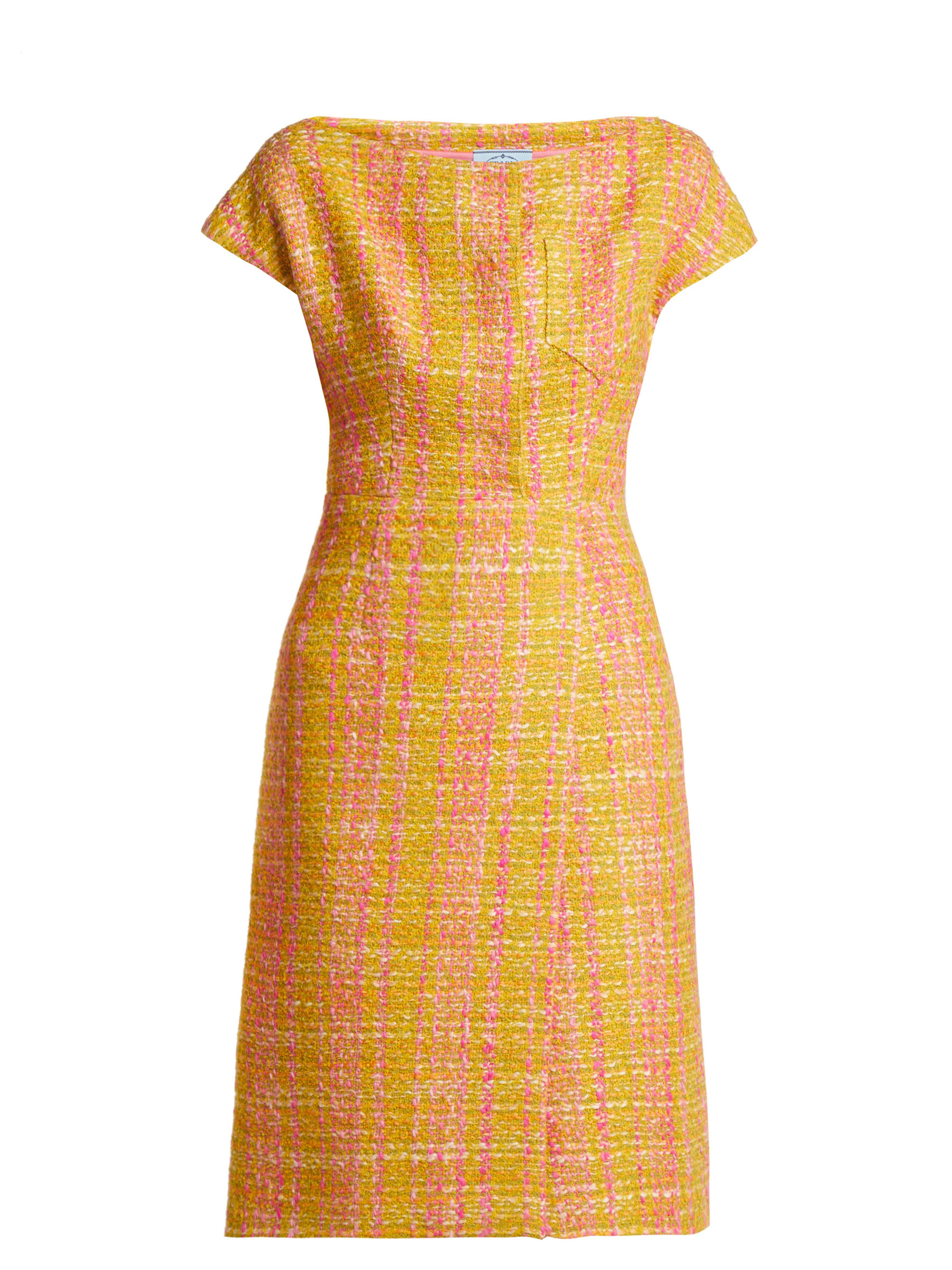 Prada - shape is integral to the design of prada's yellow and pink tweed bouclé midi dress which is exclusive to matchesfashion. Com for the launch of 5 carlos place. The product of fine italian craftsmanship, it features a flattering boat neckline, short cap sleeves and long darts to define the waist, while pink satin lining ensures a clean drape. Heighten the vibrant mood by styling it with shoulder-skimming earrings and velvet block heels. 15%ea85%pl. Colour: yellow